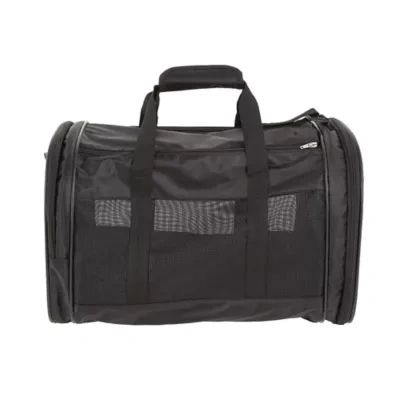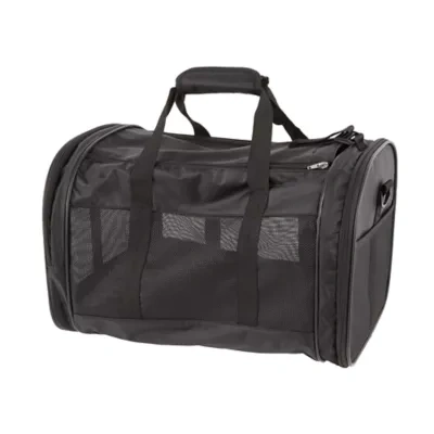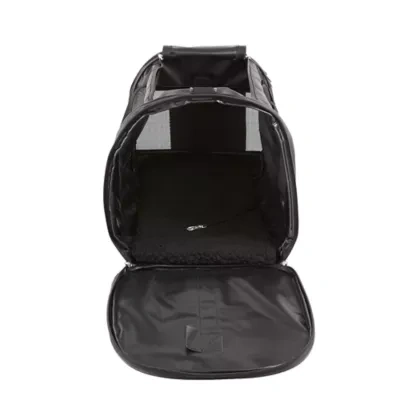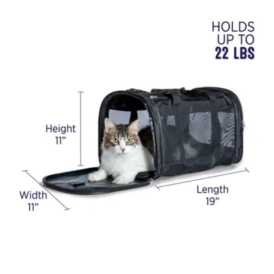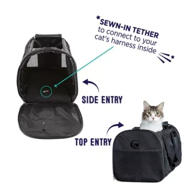 92Black pet carrier with side and top entry. Features a sewn-in tether to connect to your cat's harness inside. Measures 11 inches wide, 11 inches high, and 19 inches long.
