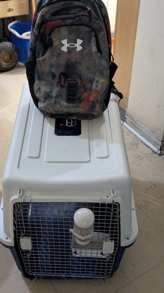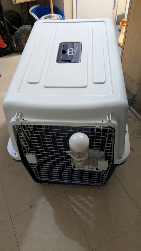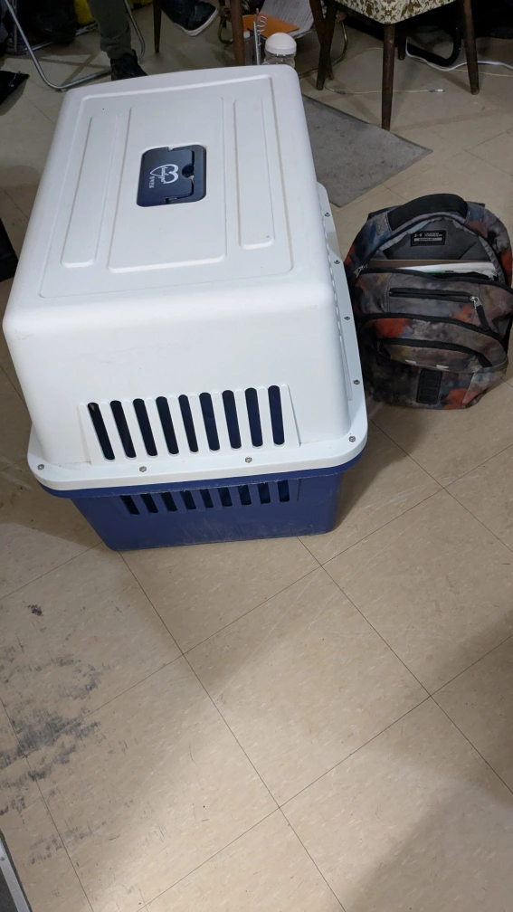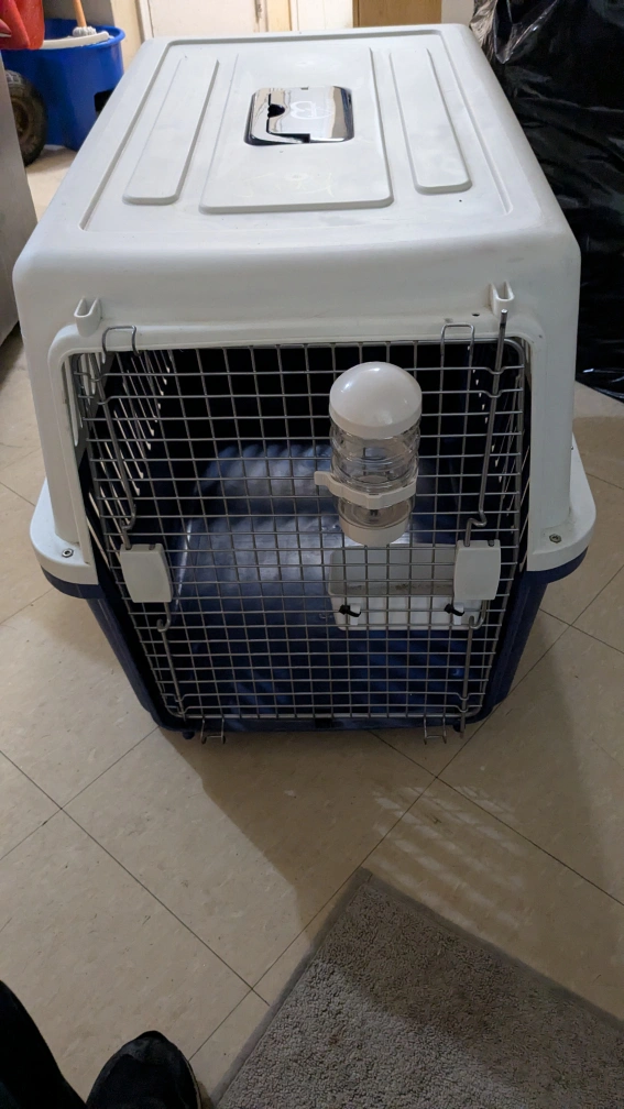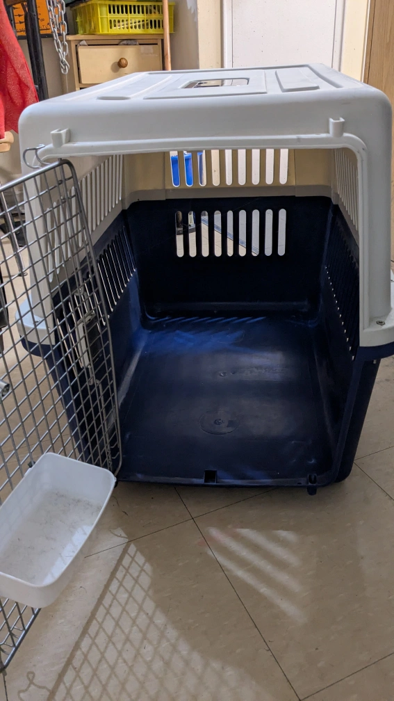 Large pet carrier, blue and white. Includes a small travel water bottle and food bowl. Large size in like new condition.