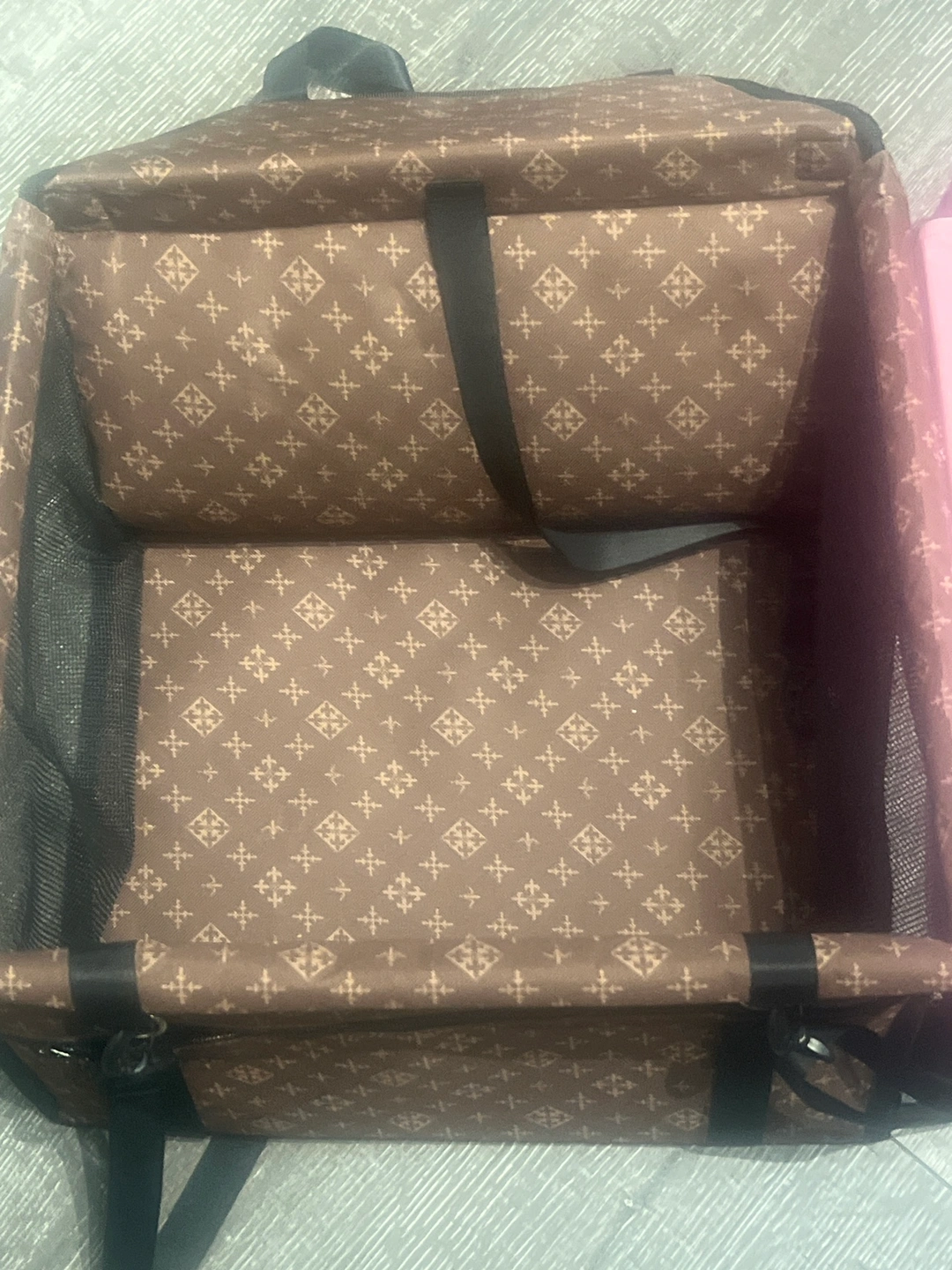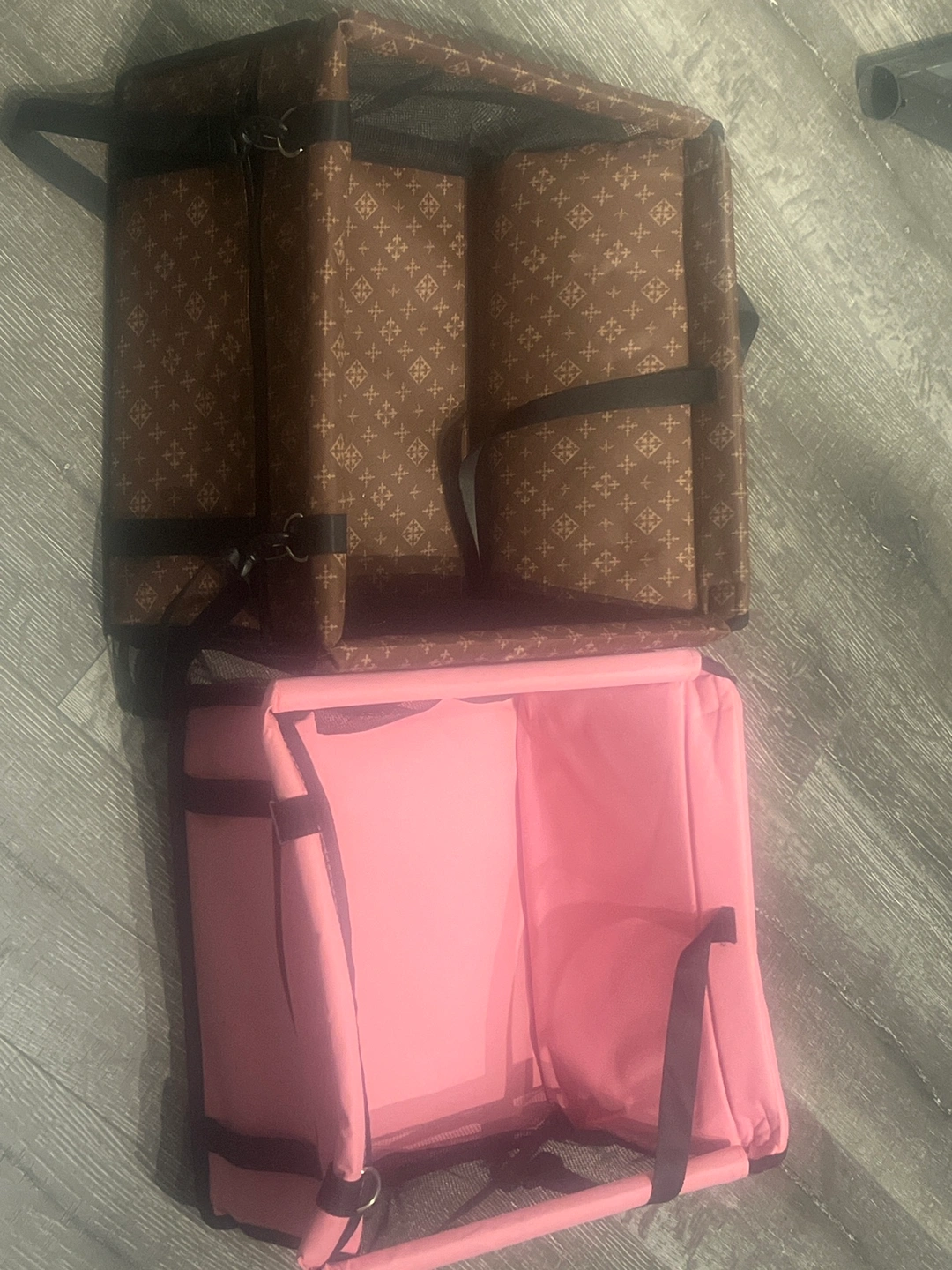 Two pet carriers, one brown and one pink. Both have a zipper opening and a mesh window. They also have a strap for carrying and clips to secure them to a seat. 15.00 each or $25.00 for both