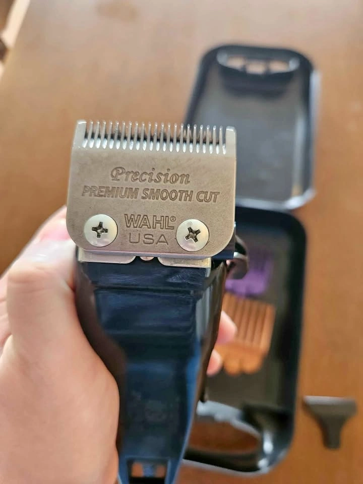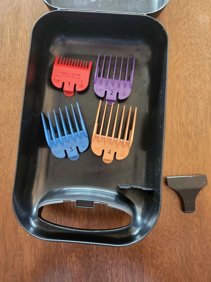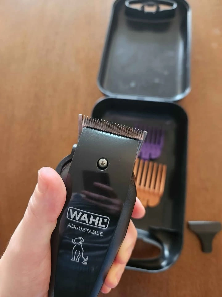 Adjustable Wahl pet grooming clippers. The unit itself features two different blade adjustments depending on how close you want to groom your best friend. Comes in original case, with four comb attachments and a blade guard.