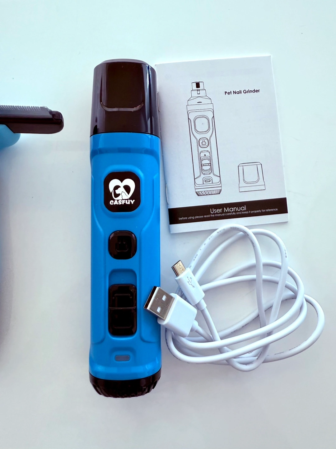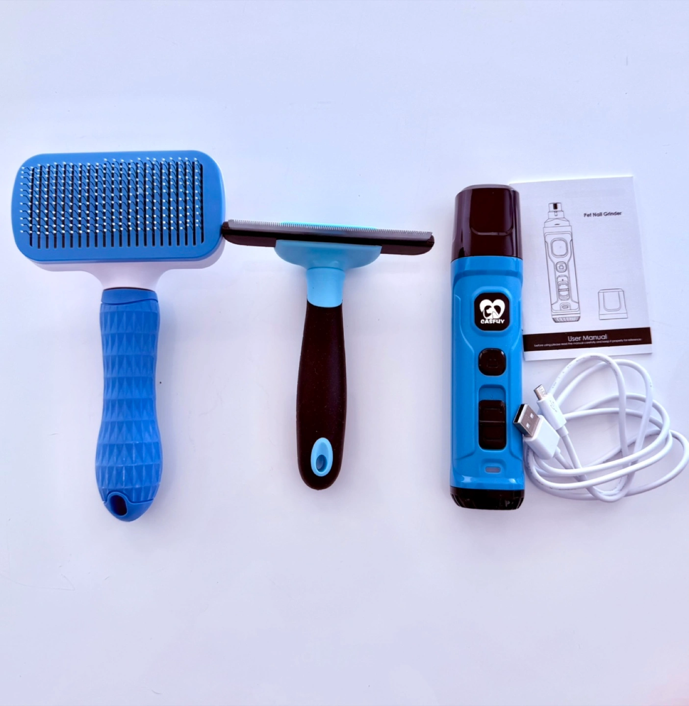 135Includes a pet nail grinder, a deshedding brush, and a self-cleaning slicker brush. The kit comes with a user manual and a charger for the nail grinder. Great for keeping your furry friends looking their best!