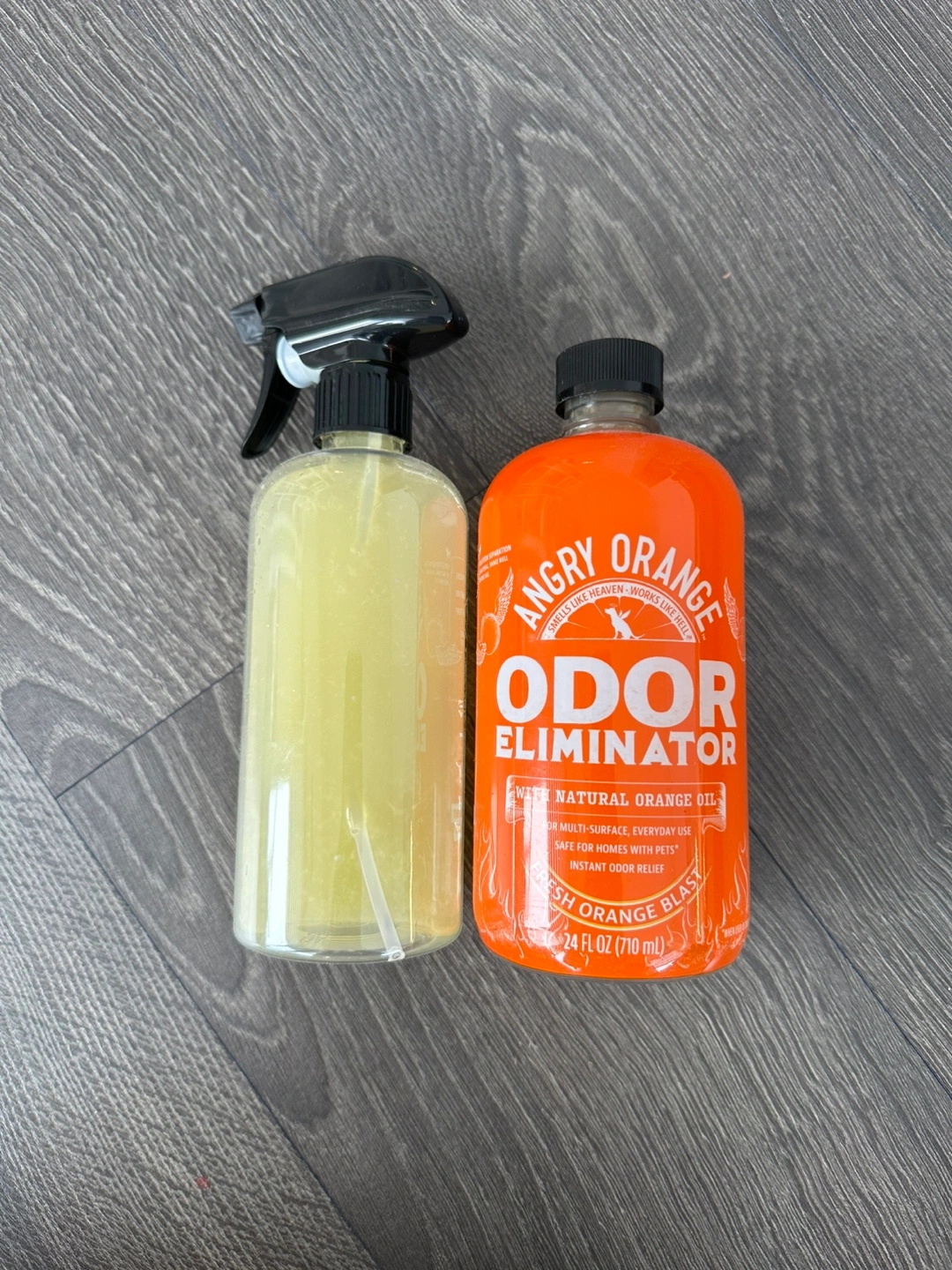 The original bottle is about little more than half full, and the spray bottle is half full as well. Spray bottle makes its easy to spritz.