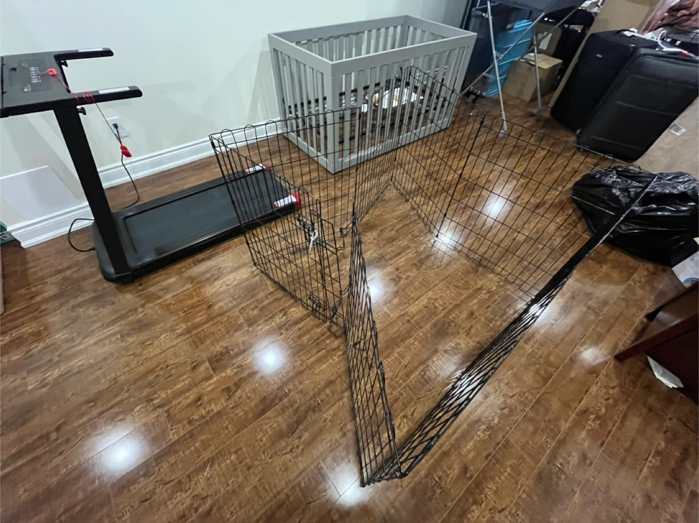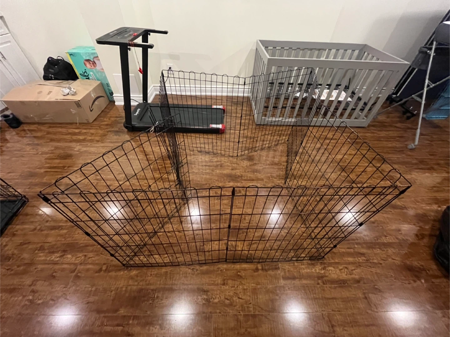 Selling a pet playpen made of black wire. It's in great condition and ready for a new home for your furry friend! Perfect for keeping your pet safe and secure, whether indoors or outdoors
