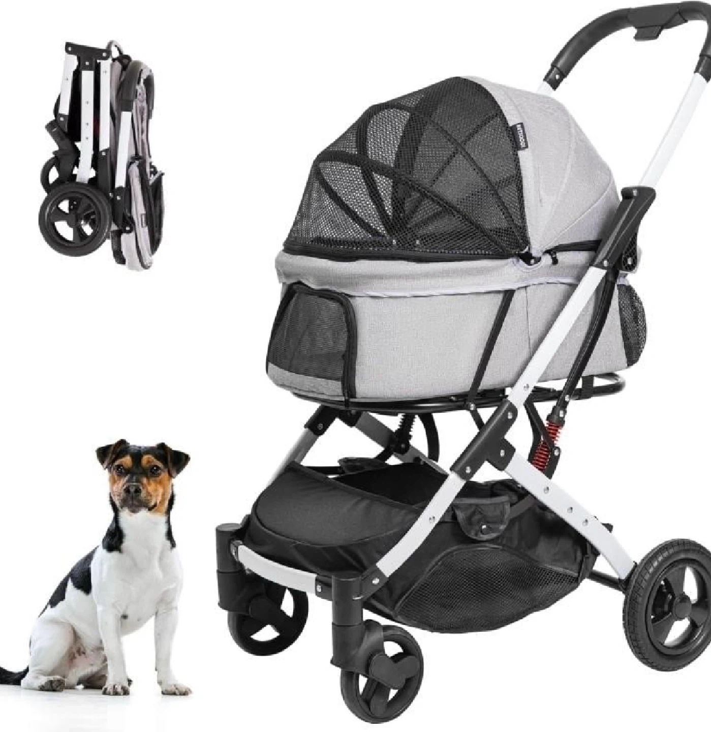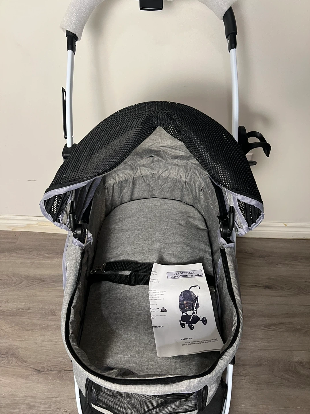 Selling a pet stroller in great condition! It's perfect for taking your furry friend on walks or errands. It's lightweight and easy to fold for storage or transport. The stroller features a comfortable interior and a mesh top for ventilation. Comes with the instruction manual too!