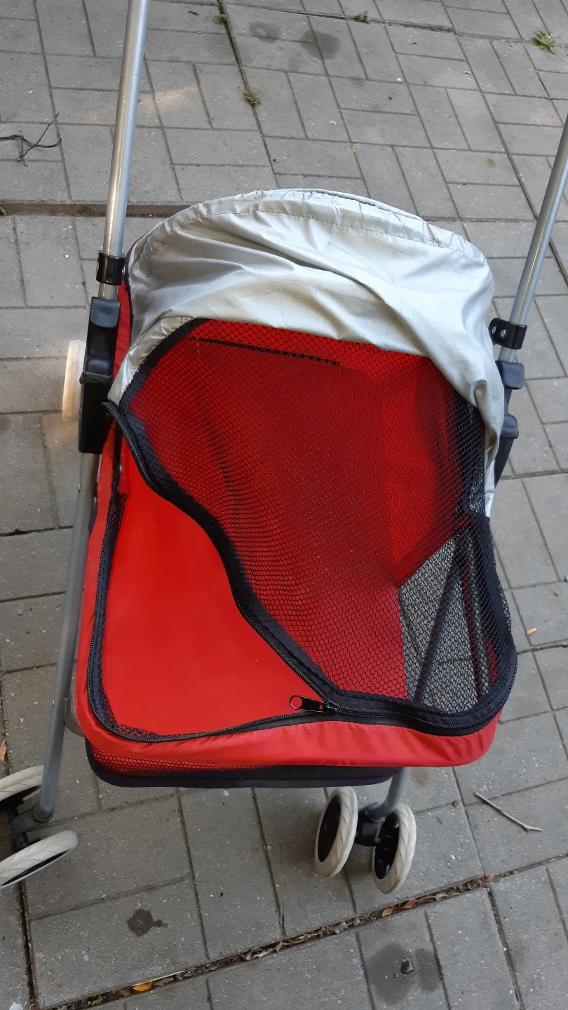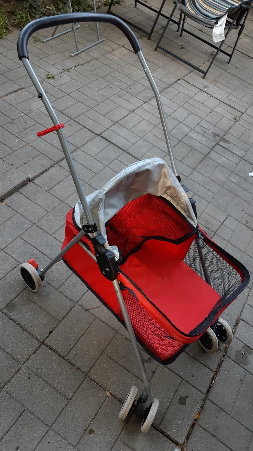 104Red and silver pet stroller. Four small wheels. Features a canopy. Great for taking your pet for relaxing walks.