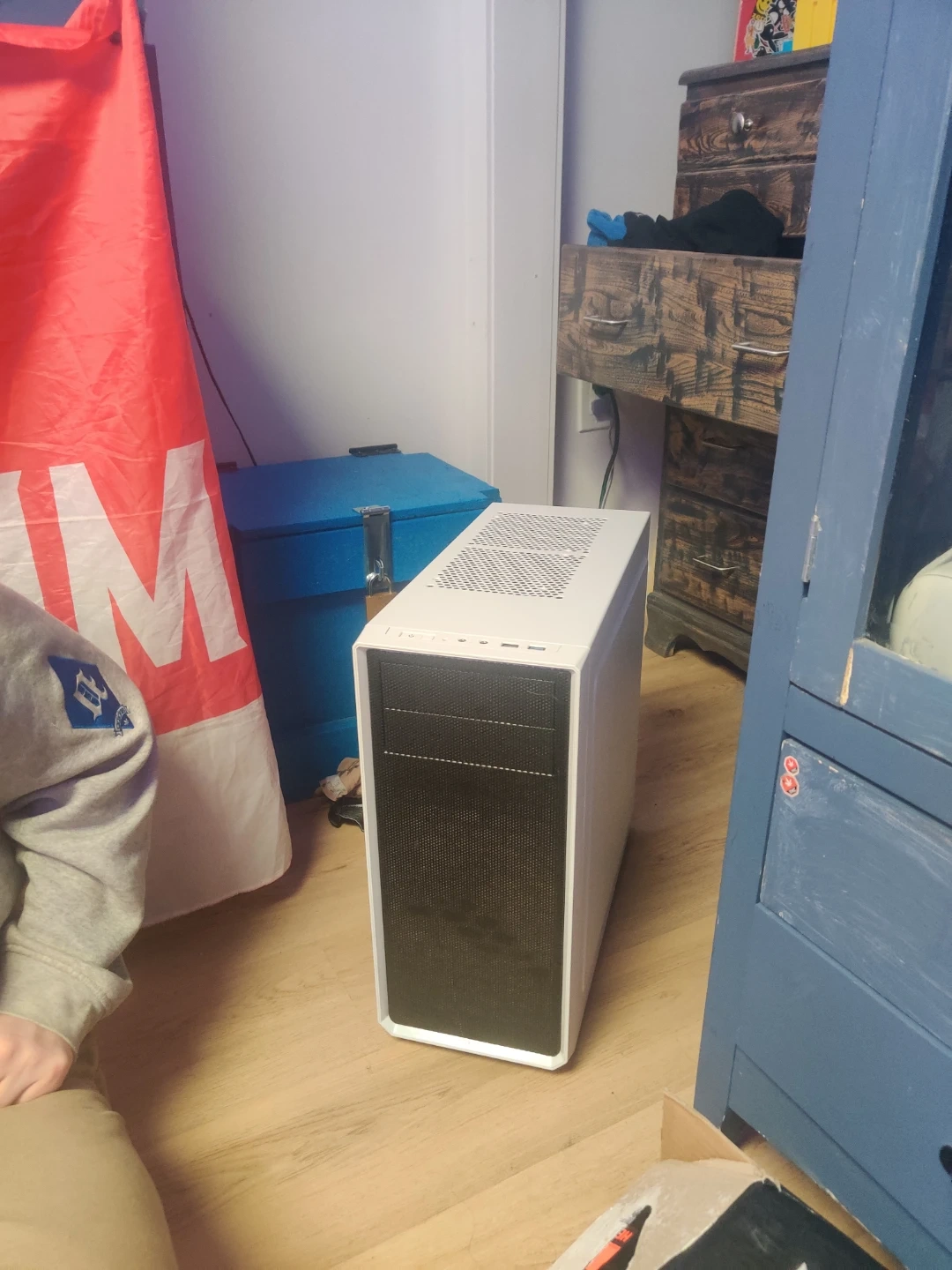 This is a white mid-tower PC case. It's suitable for building a custom desktop computer. The case has good ventilation with its mesh front panel.
