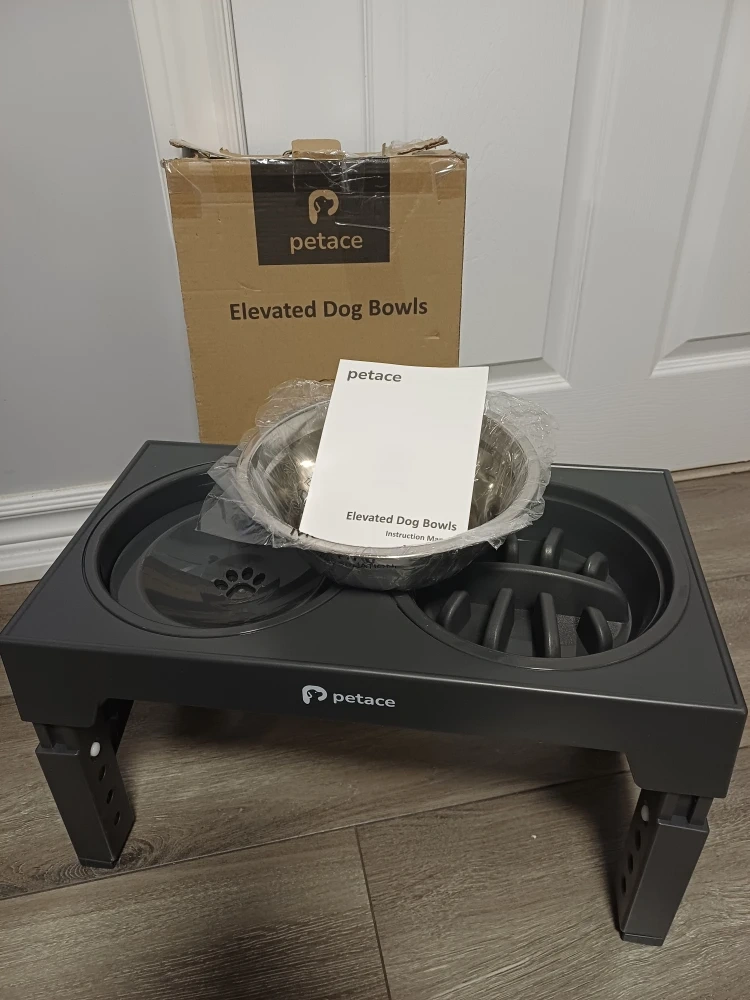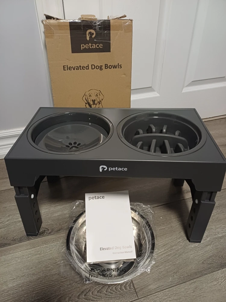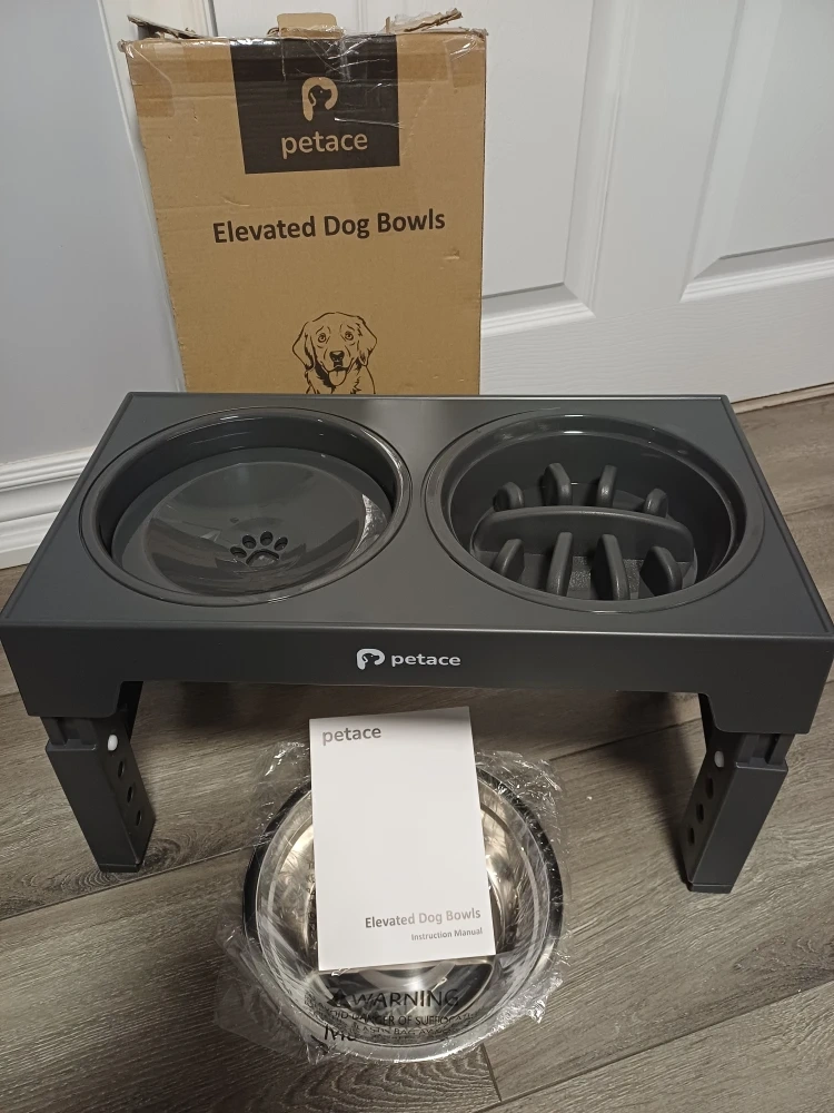 112I have a brand new set of Petace elevated dog bowls still in the box! It comes with the instruction manual as well. The bowls are designed to help with digestion and reduce neck strain for your furry friend. Included are three bowls, one for water bowl, one for slow feeder and one is a regular stainless steel bowl.