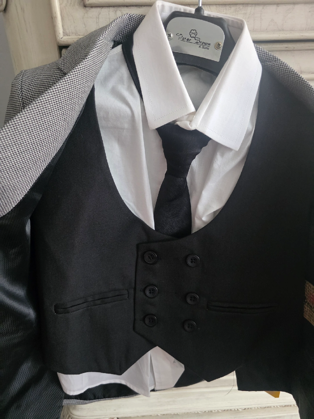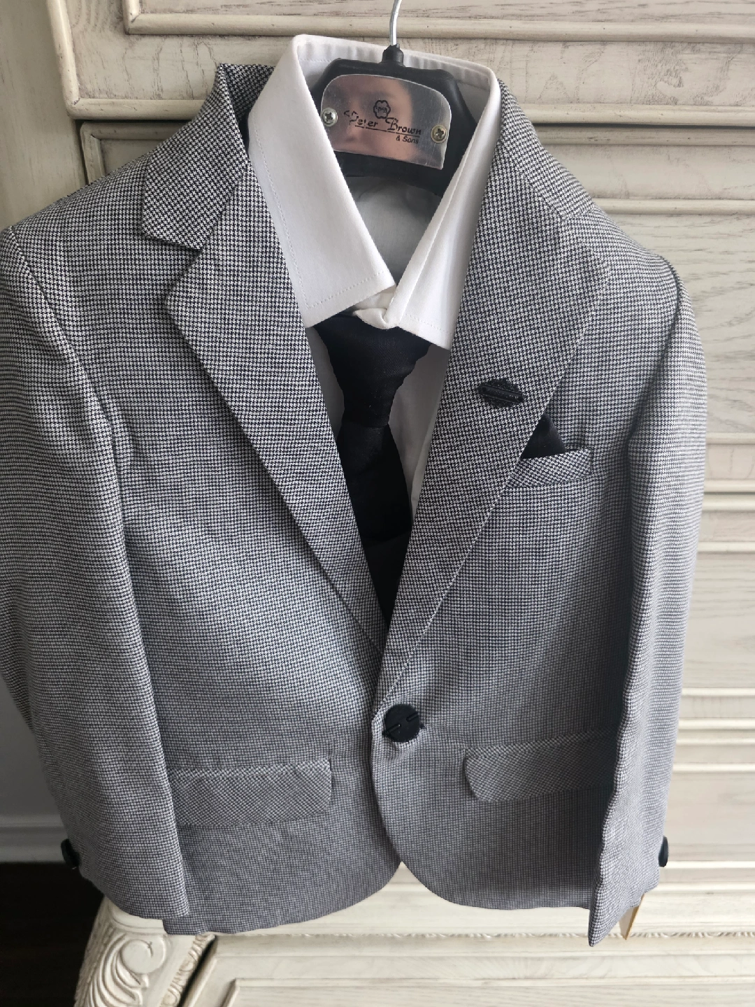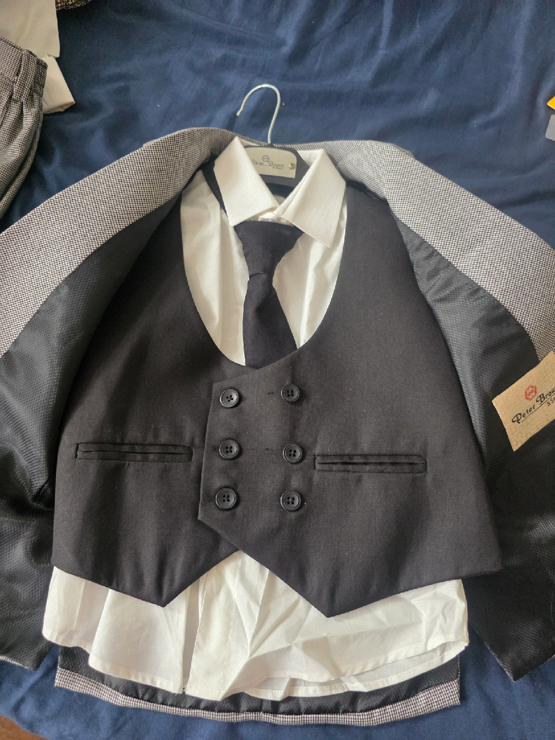 A complete suit set from Peter Brown & Sons, perfect for a young gentleman! Includes the jacket, vest, shirt, and tie. Great for special occasions or dressing up.
