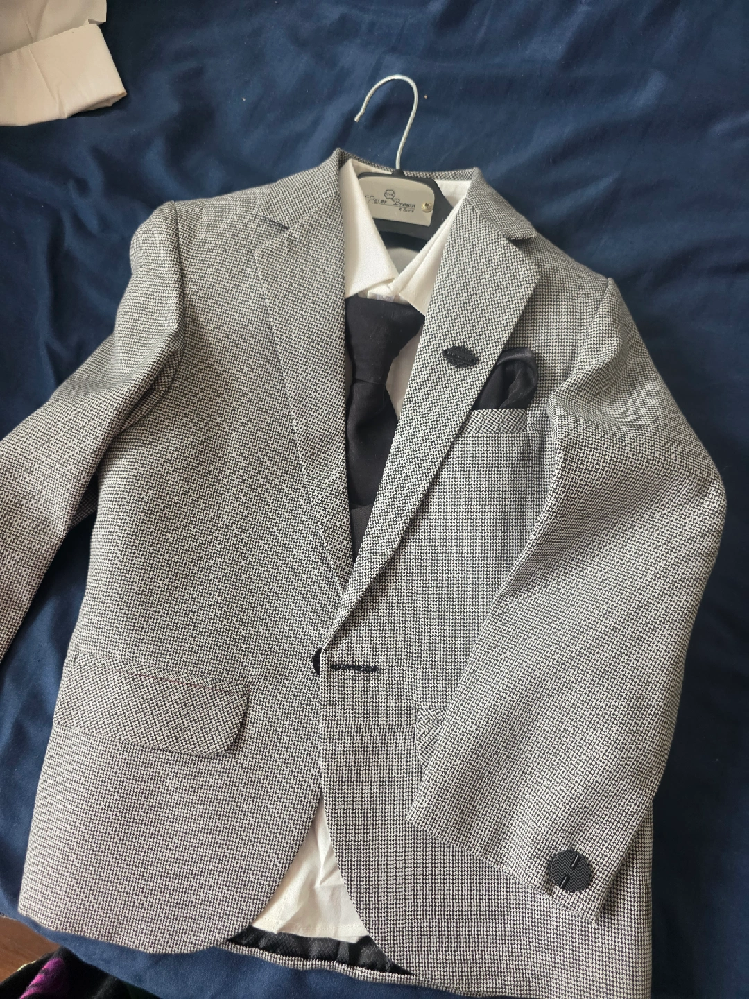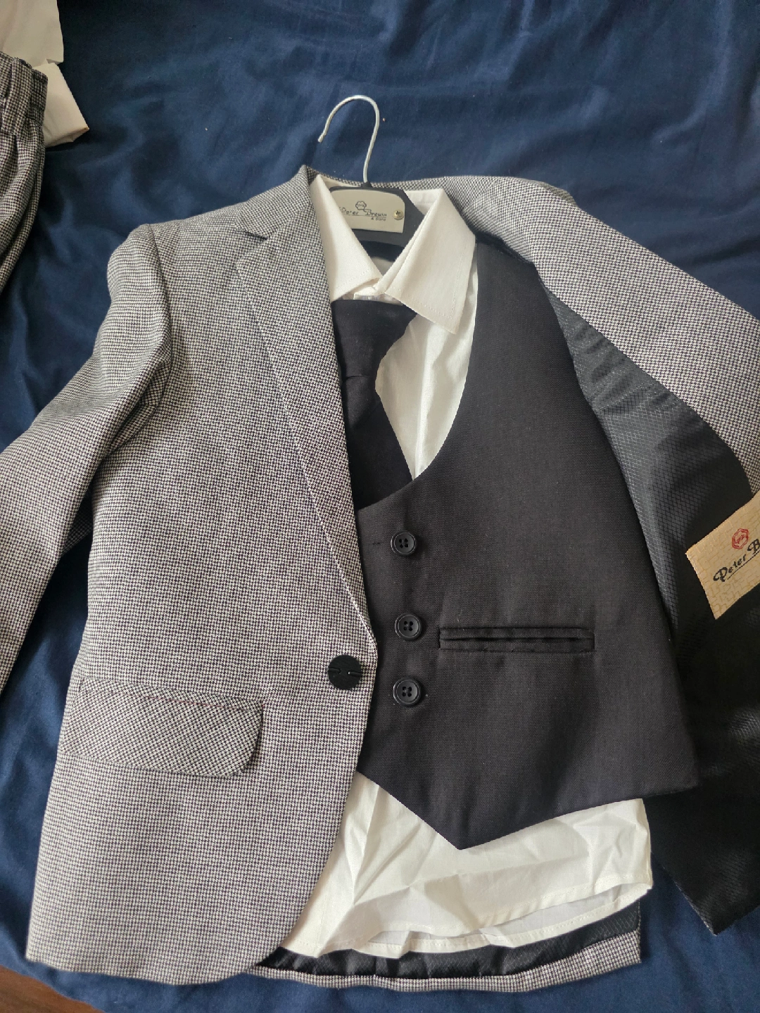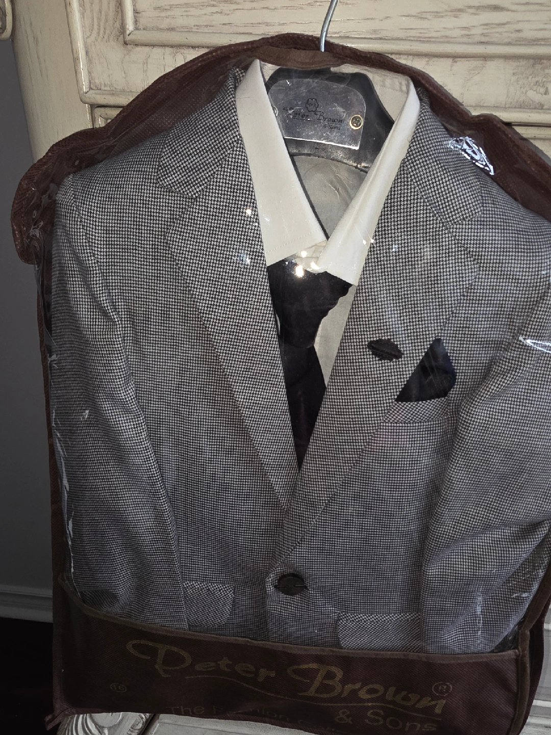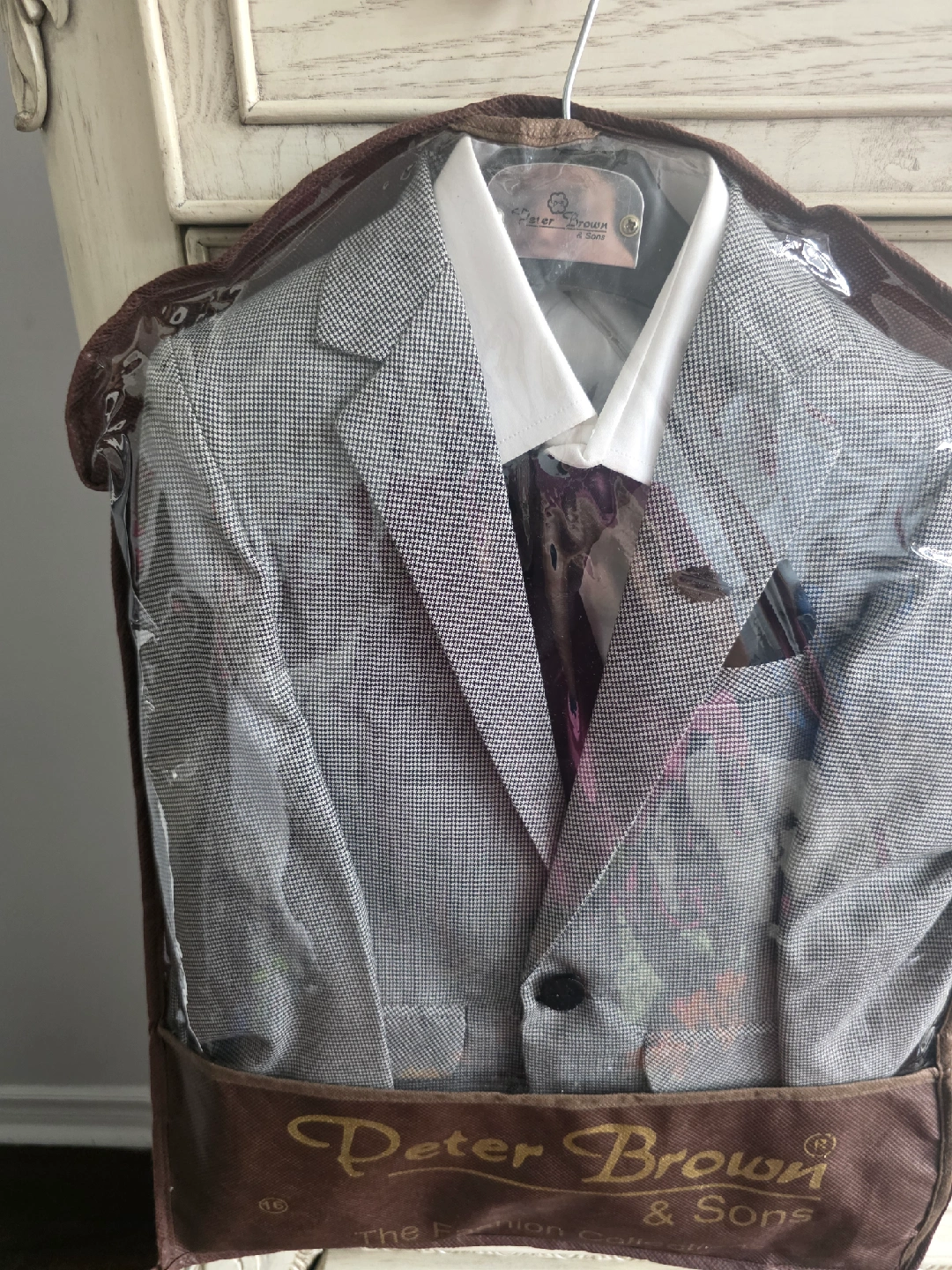 A complete suit set from Peter Brown & Sons, perfect for a young gentleman! Includes the jacket, vest, shirt, and tie. Great for special occasions or dressing up.