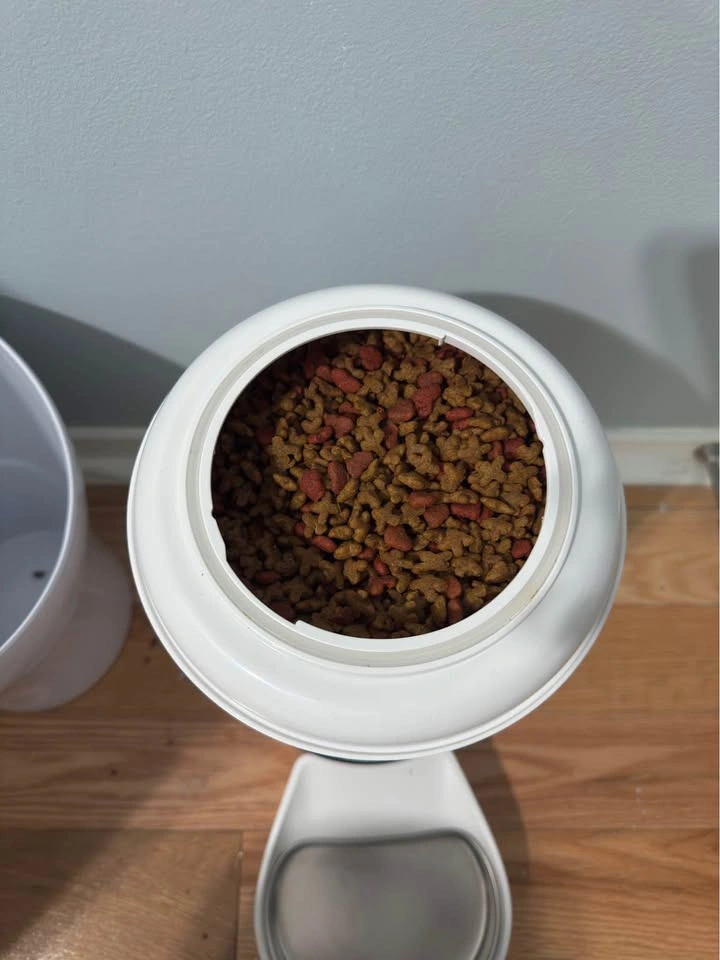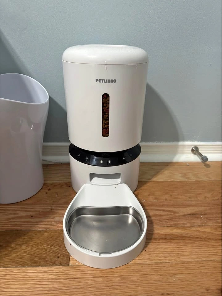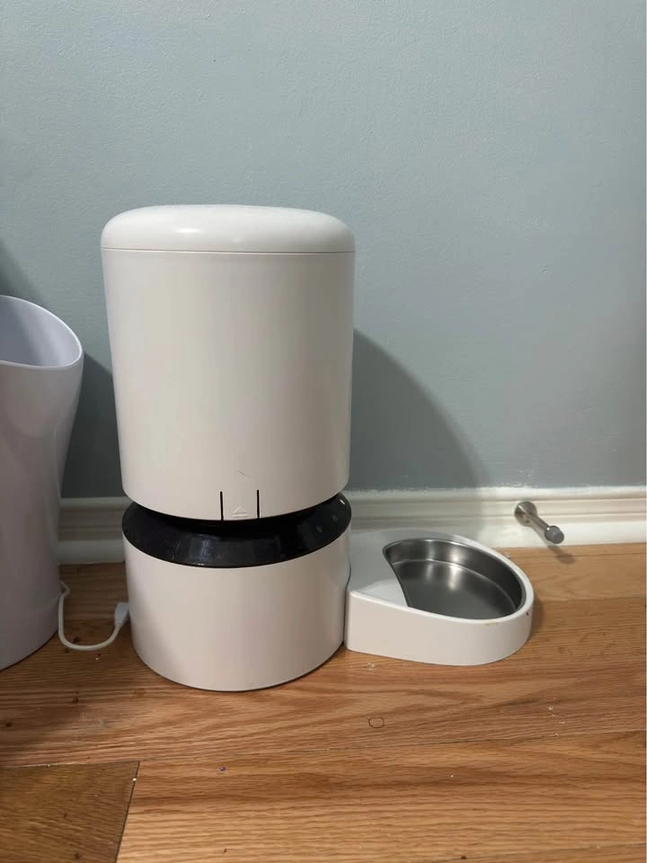 Dry food cat feeder that can feed your cats on a schedule. Set it and forget it solution. - Dedicated app - Camera for recoding cats activity - Motion sensor - fits around 2 kg of dry food - requires very little maintenance - has option to be battery powered - batteries are not included - comes with a usb c cable and power adapter - cat food is not included CASH ONLY. if the ad is up - it is available.
