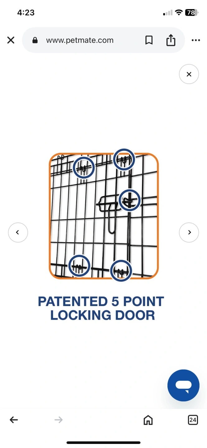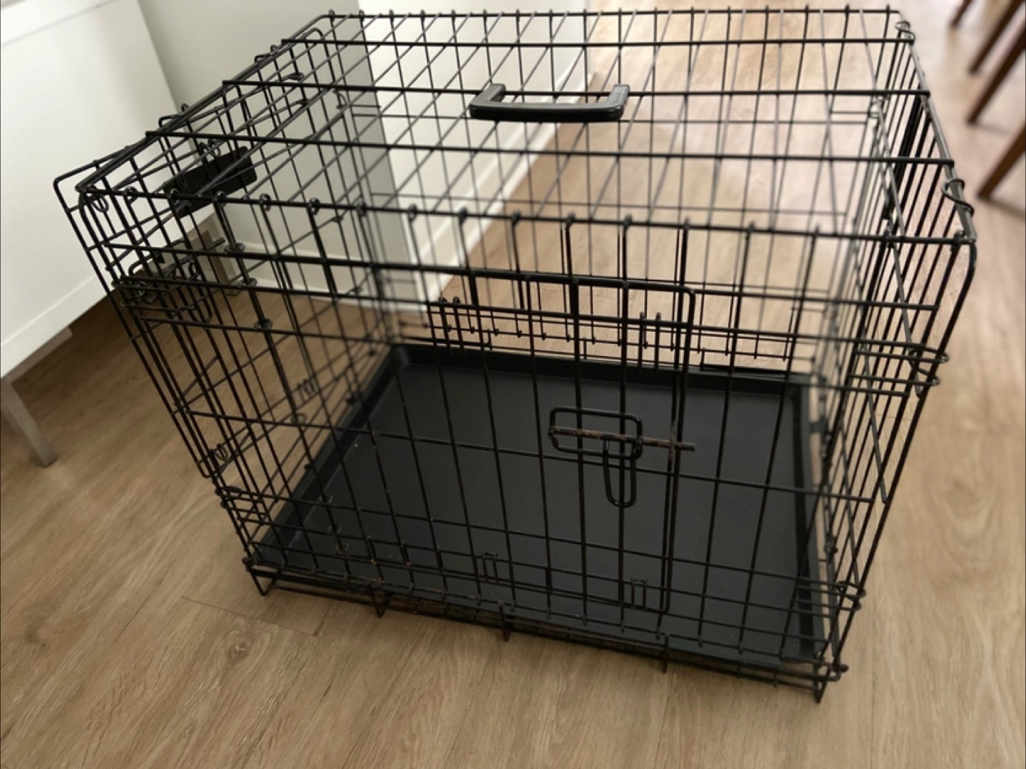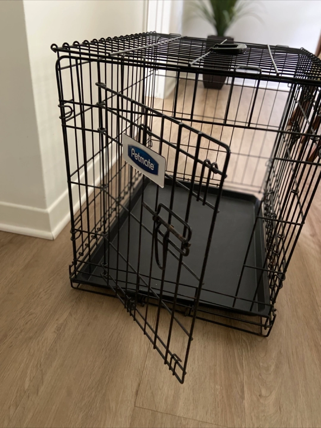 13Black wire dog crate. Includes removable plastic tray. Patented 5-point locking door. Great for small to medium-sized dogs. Retails for $113