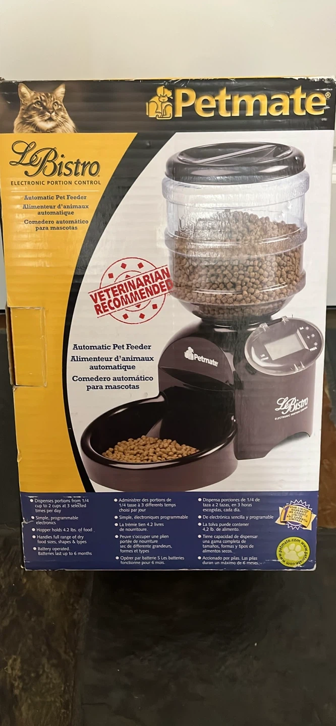 10Selling a Petmate Le Bistro automatic pet feeder. It's veterinarian recommended and dispenses portions from 1/4 cup to 2 cups at 3 selected times per day. It has simple, programmable electronics and the hopper holds 4.2 lbs of food. It handles a full range of dry food sizes, shapes and types. Battery operated.