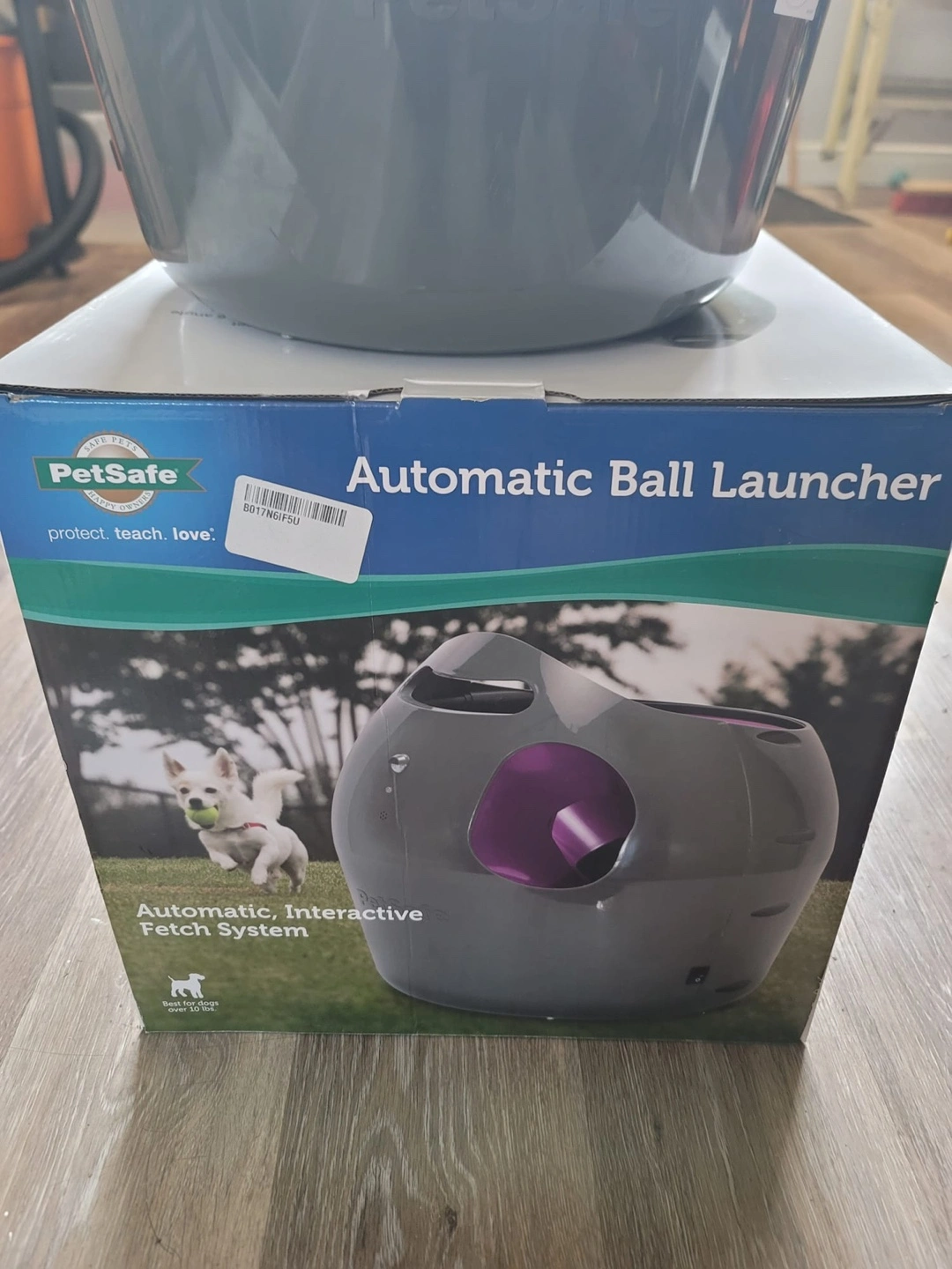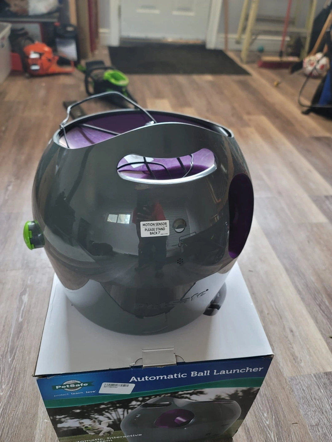 28A grey and purple automatic ball launcher. Place this in your yard and keep your furry friend entertained for hours. My dog is scared of it.
