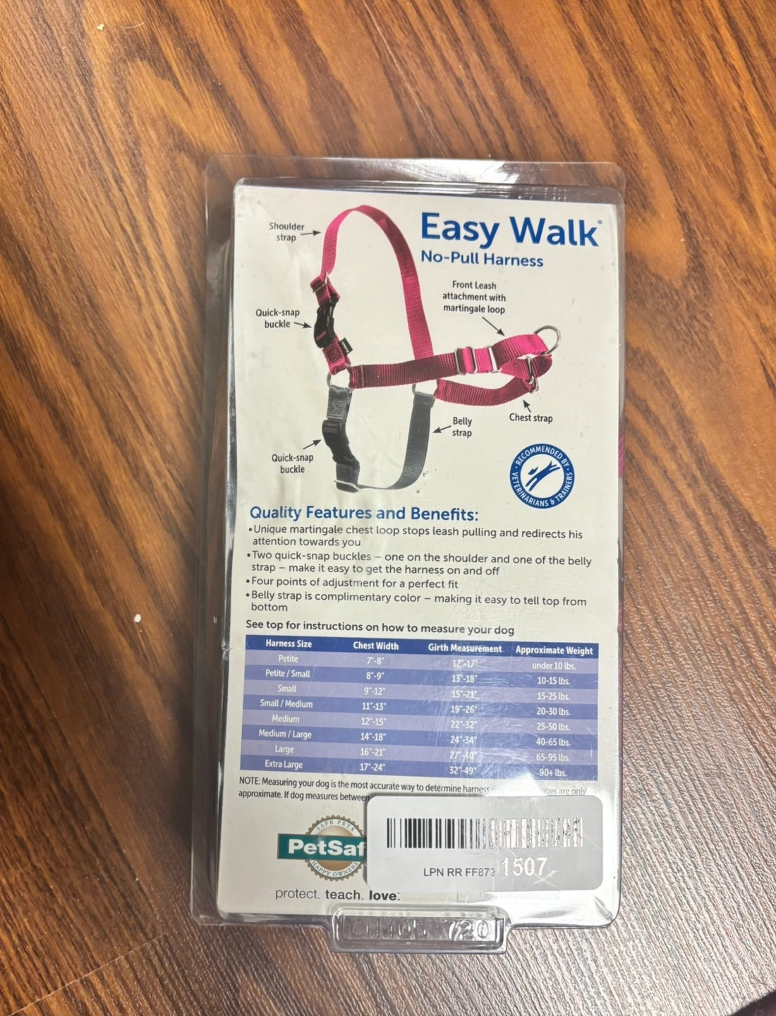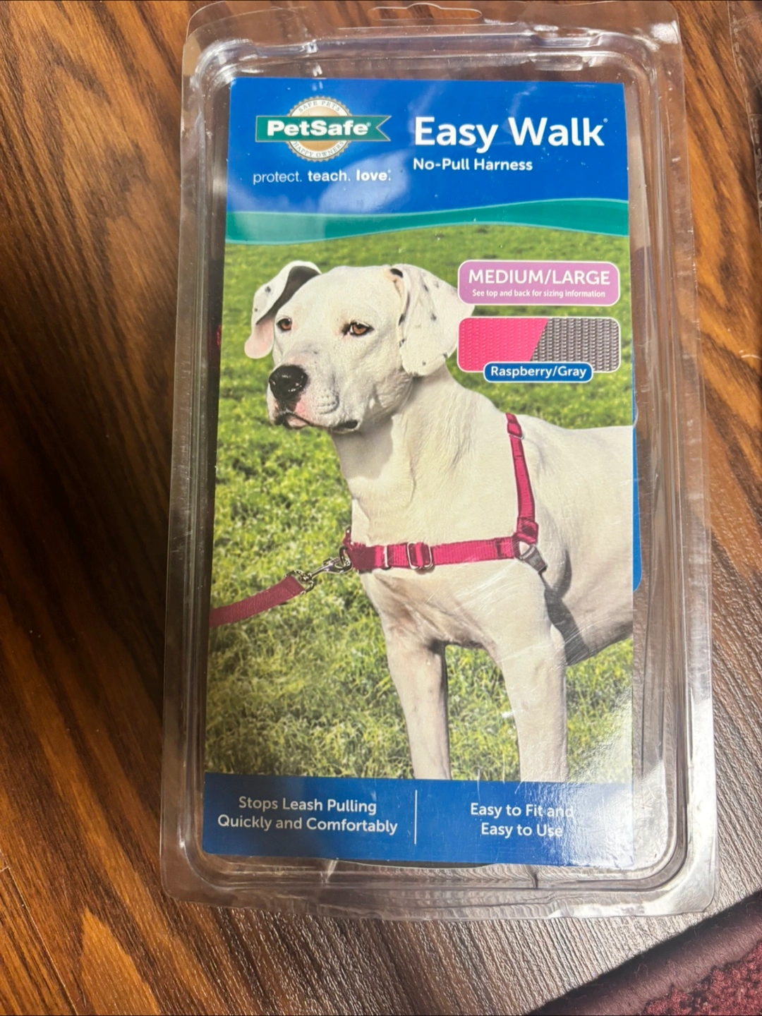 98PetSafe Easy Walk harness. It is a raspberry and grey colour. The item comes in a medium/large size. You could take your dog on a relaxing walk with this item.