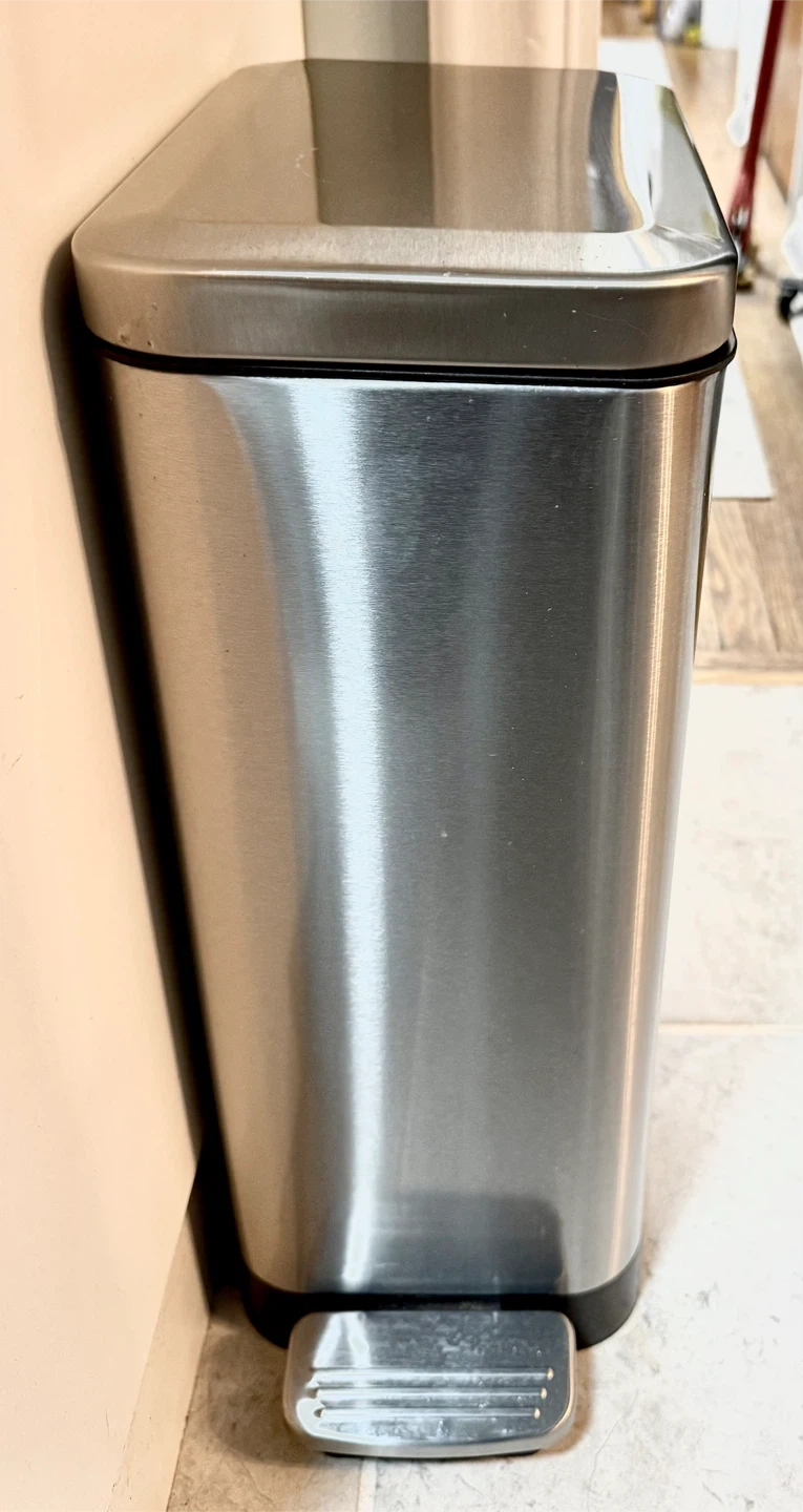 This is a stainless steel step trash can. It features a soft-close lid and a foot pedal for hands-free operation. The liner is removable for easy cleaning. It's a good size for a kitchen or bathroom.
