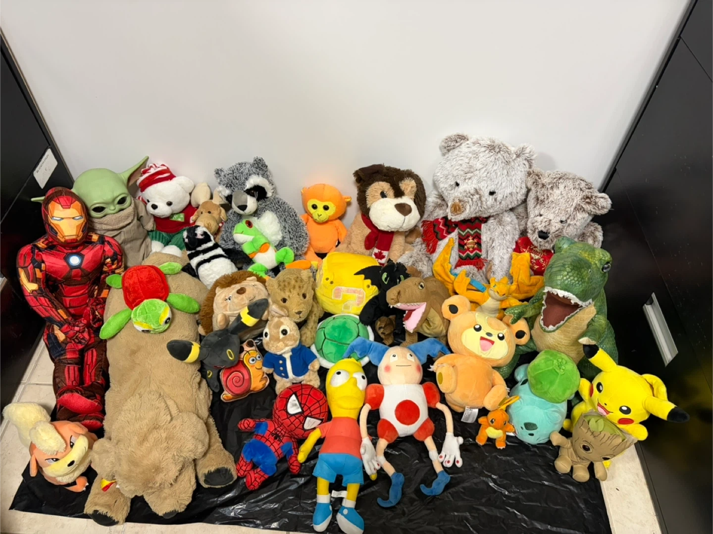 A fun collection of various plush toys including characters like Spiderman, Pikachu, Yoda, and Iron Man. Great for collectors or kids who love stuffed animals!