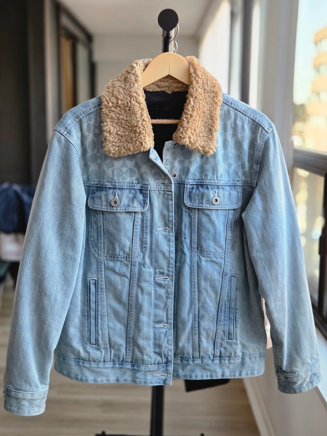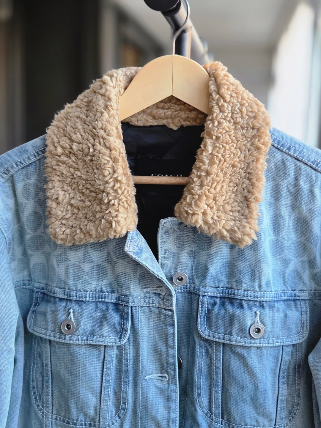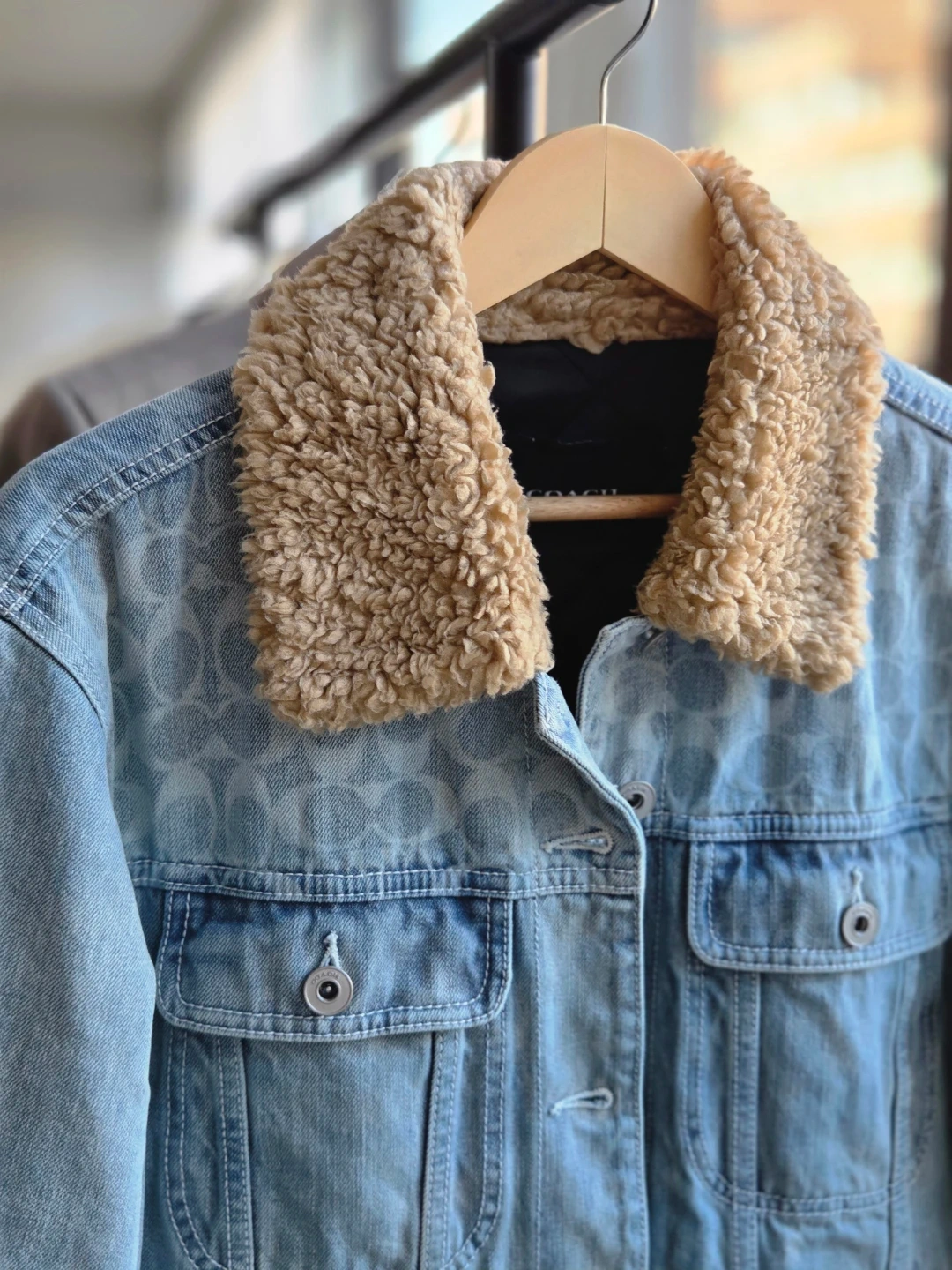 This COACH denim jacket features a warm sherpa collar. It has a classic button-up front and chest pockets. Denim material with a subtle all-over COACH pattern.