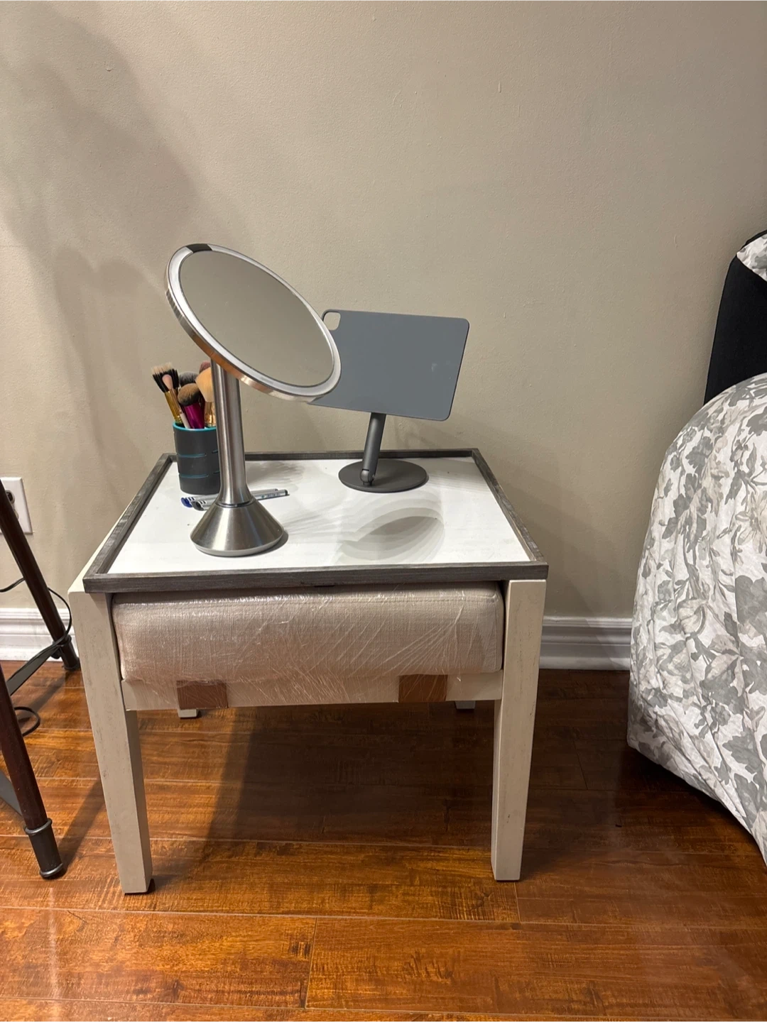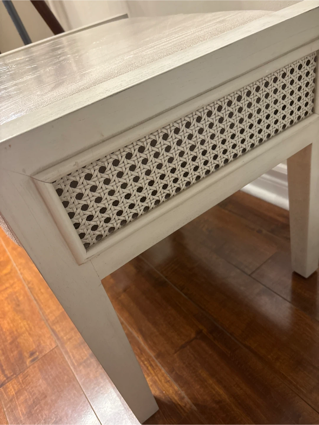 This accent table has a white distressed finish and features cane detailing on the sides. It includes a pull-out drawer upholstered in a neutral fabric. Perfect for a bedroom or living space!