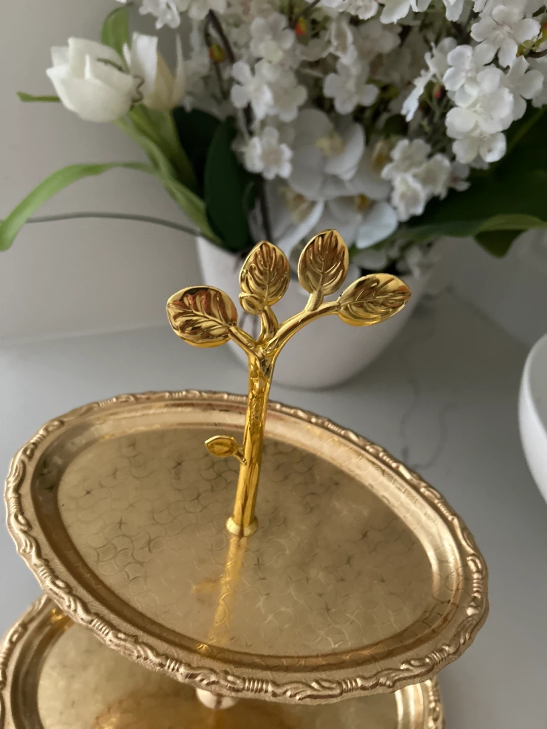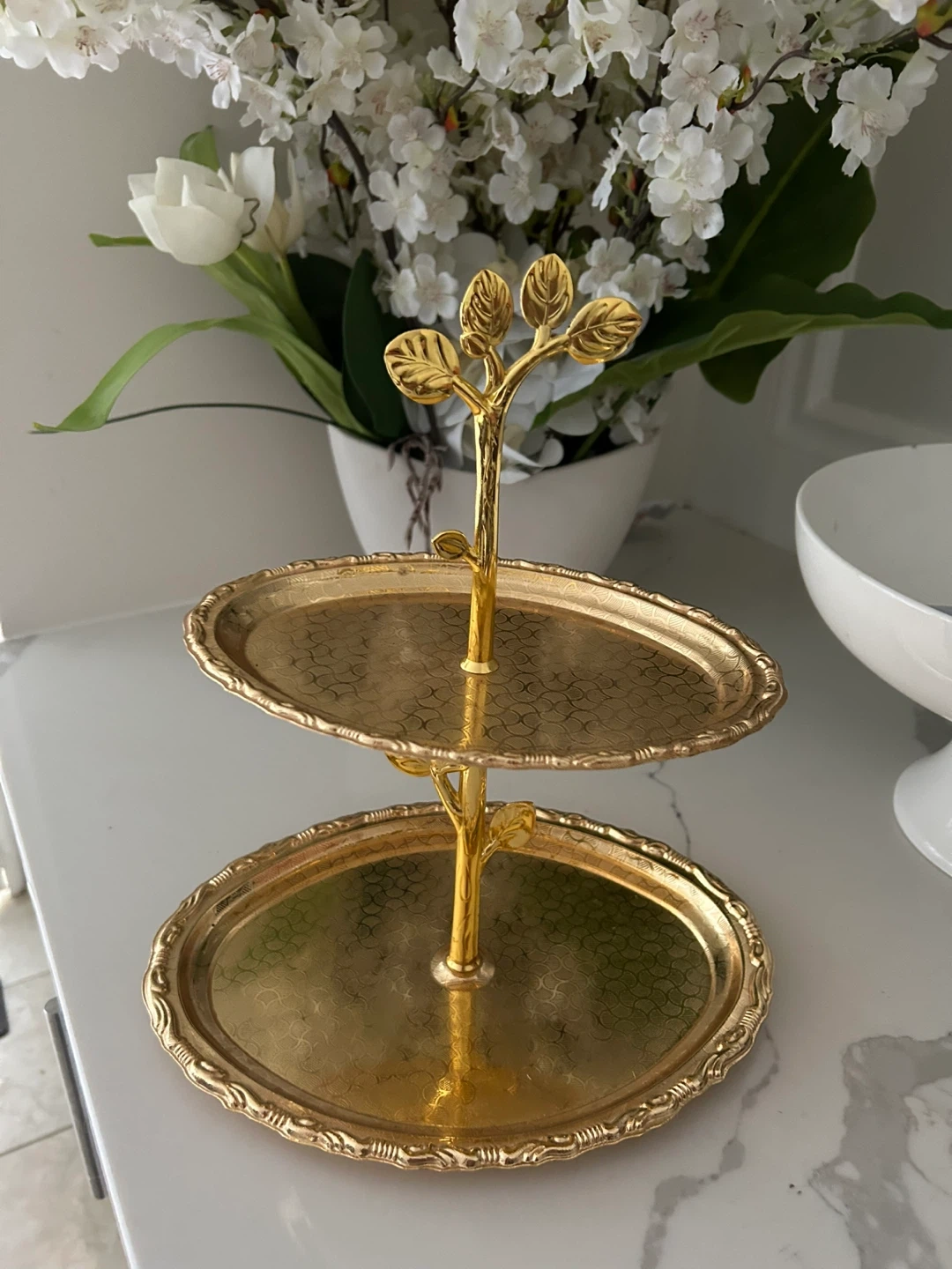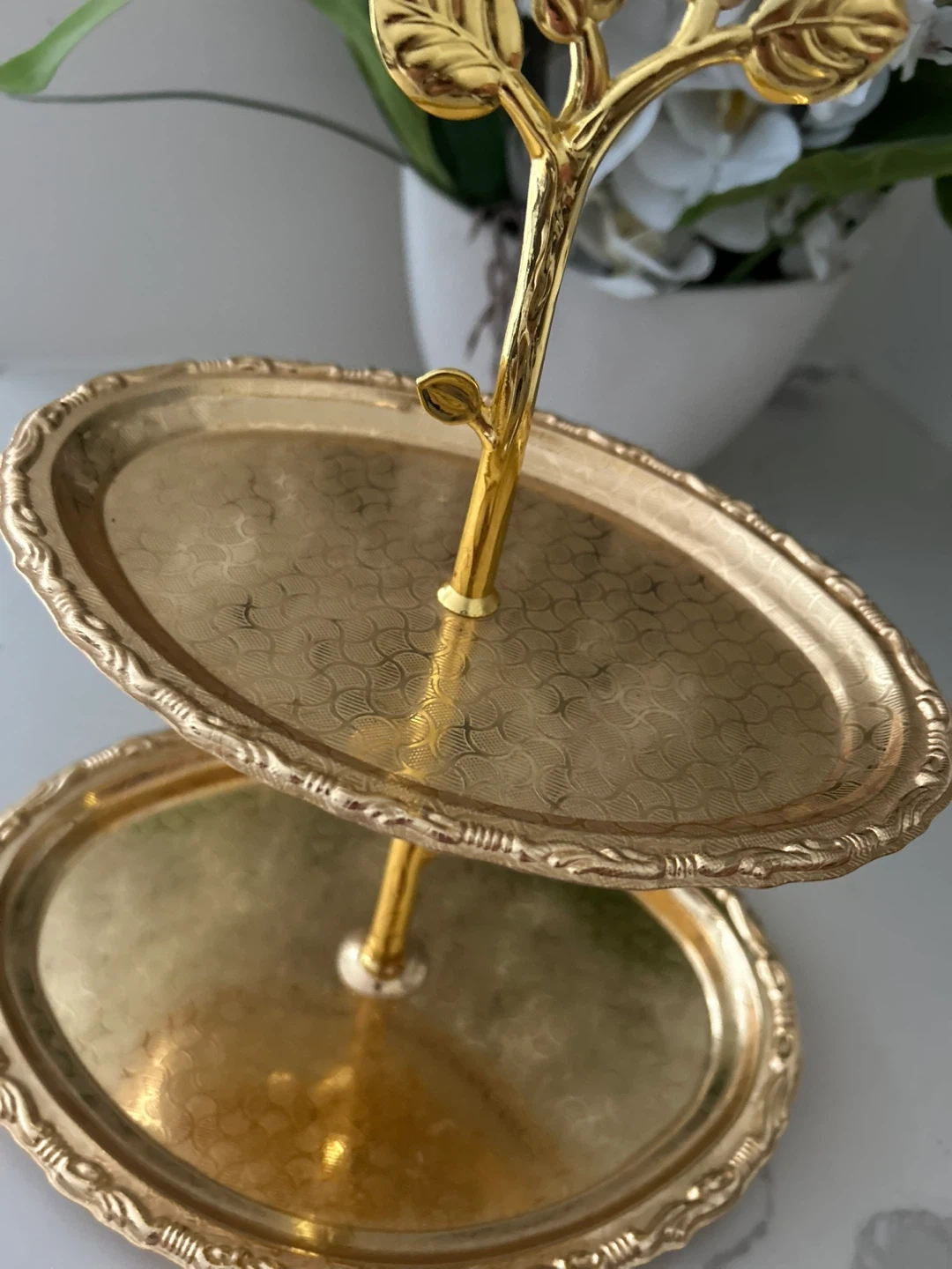 A gold-toned two-tiered serving tray with an ornate branch-like centrepiece. The oval-shaped trays have a decorative embossed pattern and scalloped edges. This elegant stand is perfect for serving desserts or appetizers.