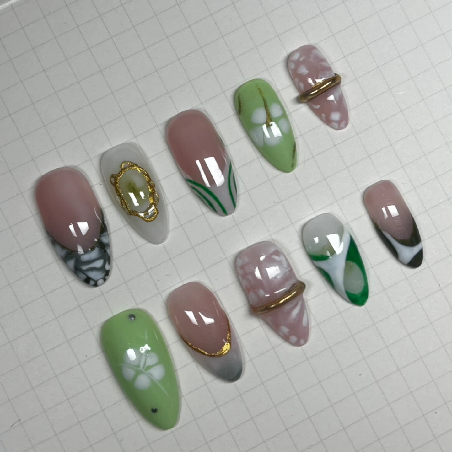 This set includes 10 custom-designed false nails, featuring a mix of floral patterns, French tips, and gold accents. Designs vary across the set, offering a unique look for each nail. These are press-on nails, ready for application. I also can ship for an additional fee