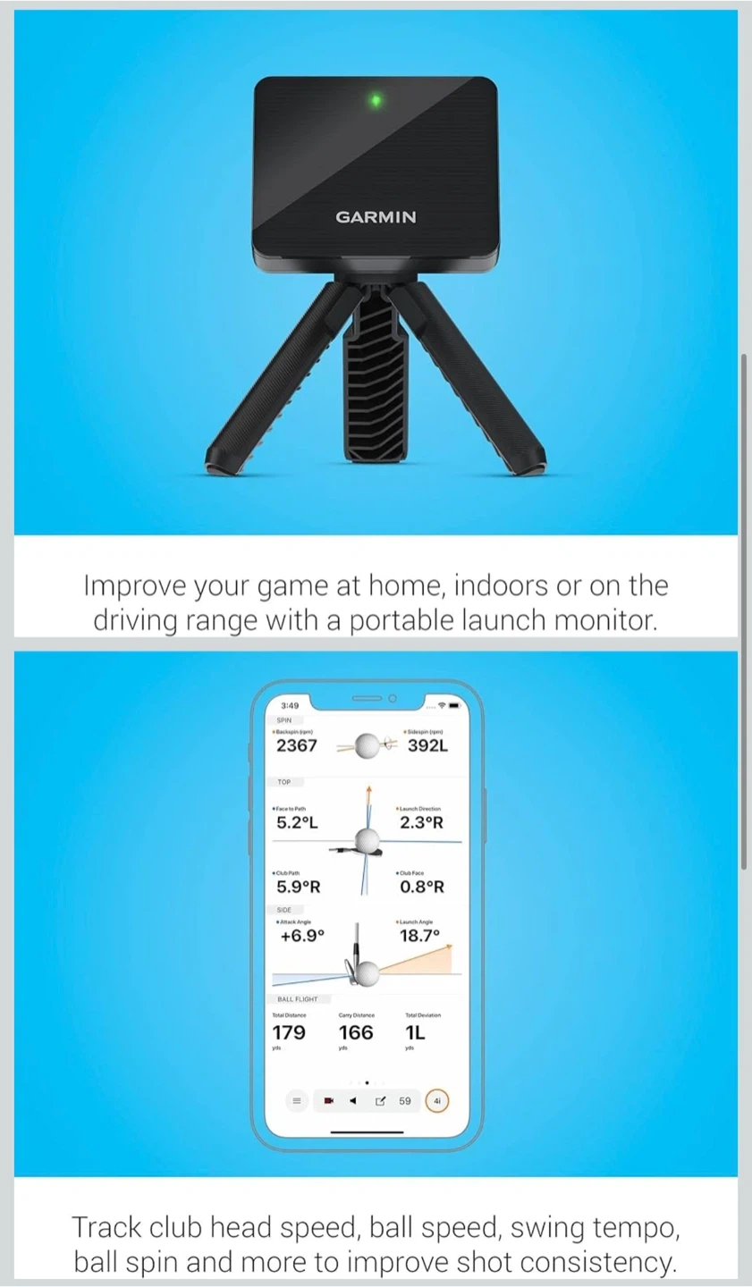 Improve your game at home, indoors, or on the driving range with this portable launch monitor. It tracks club head speed, ball speed, swing tempo, ball spin, and more to help improve shot consistency. Device requires a paired compatible smartphone downloaded with the Garmin Golf™ app.
