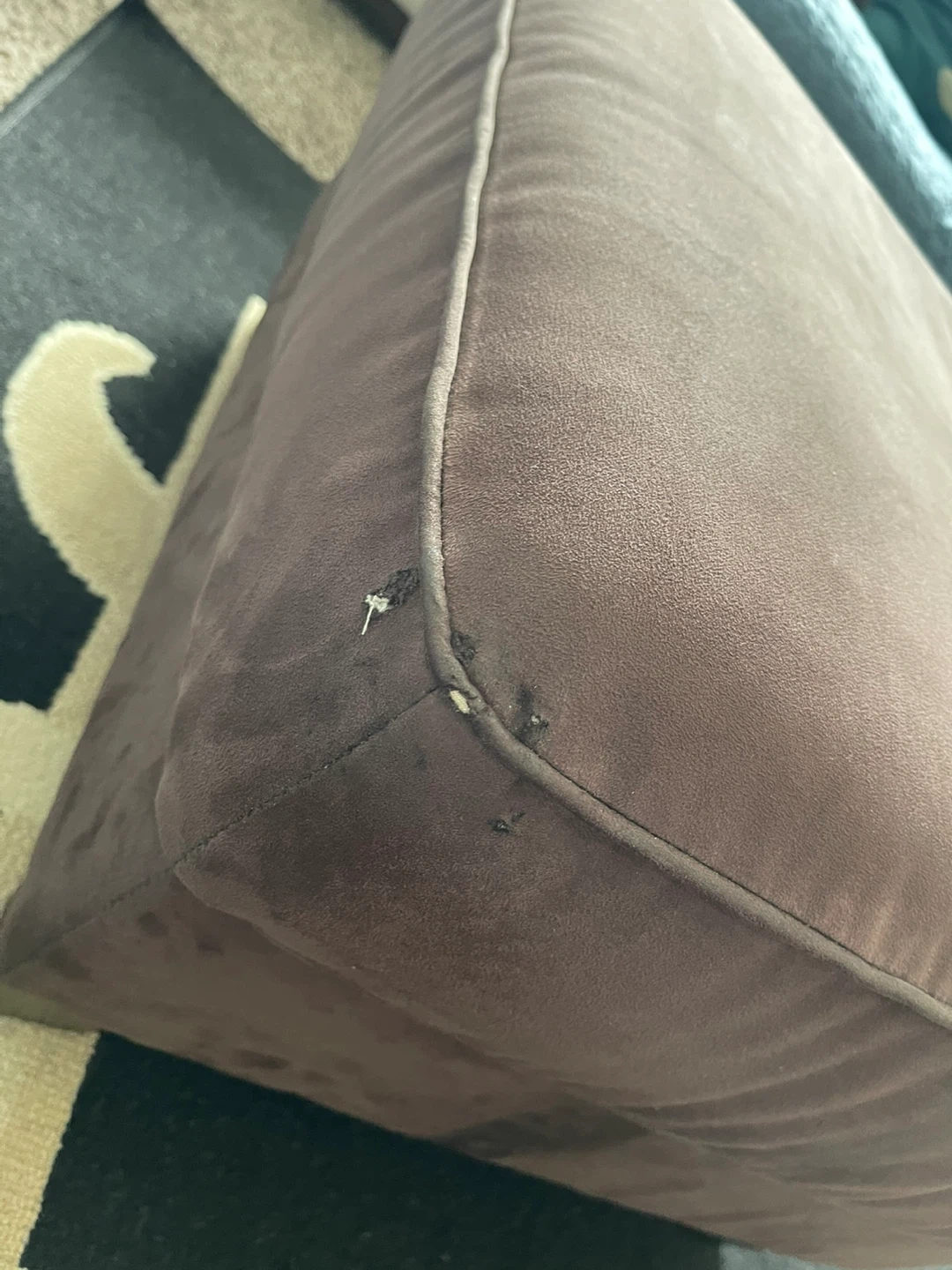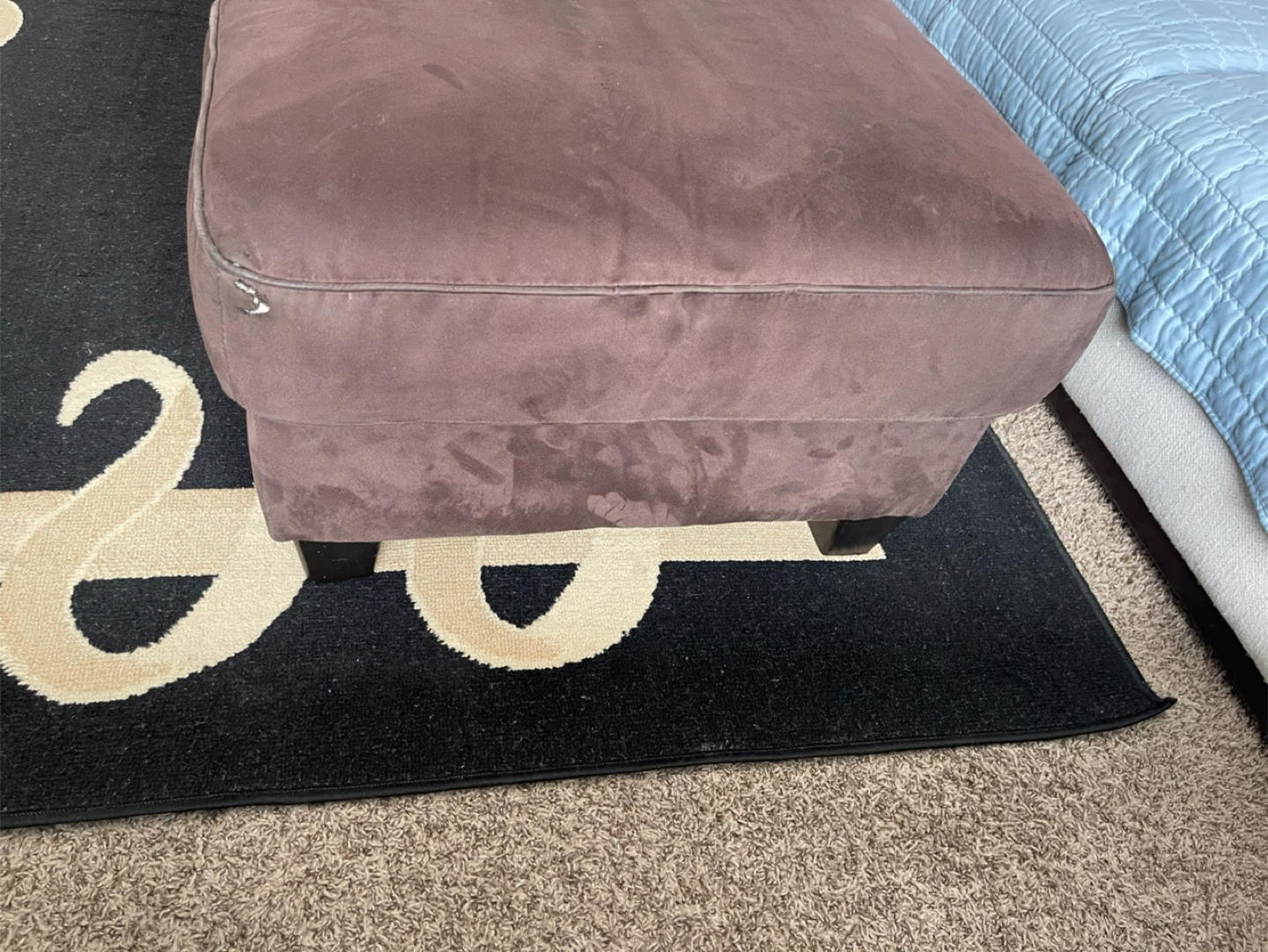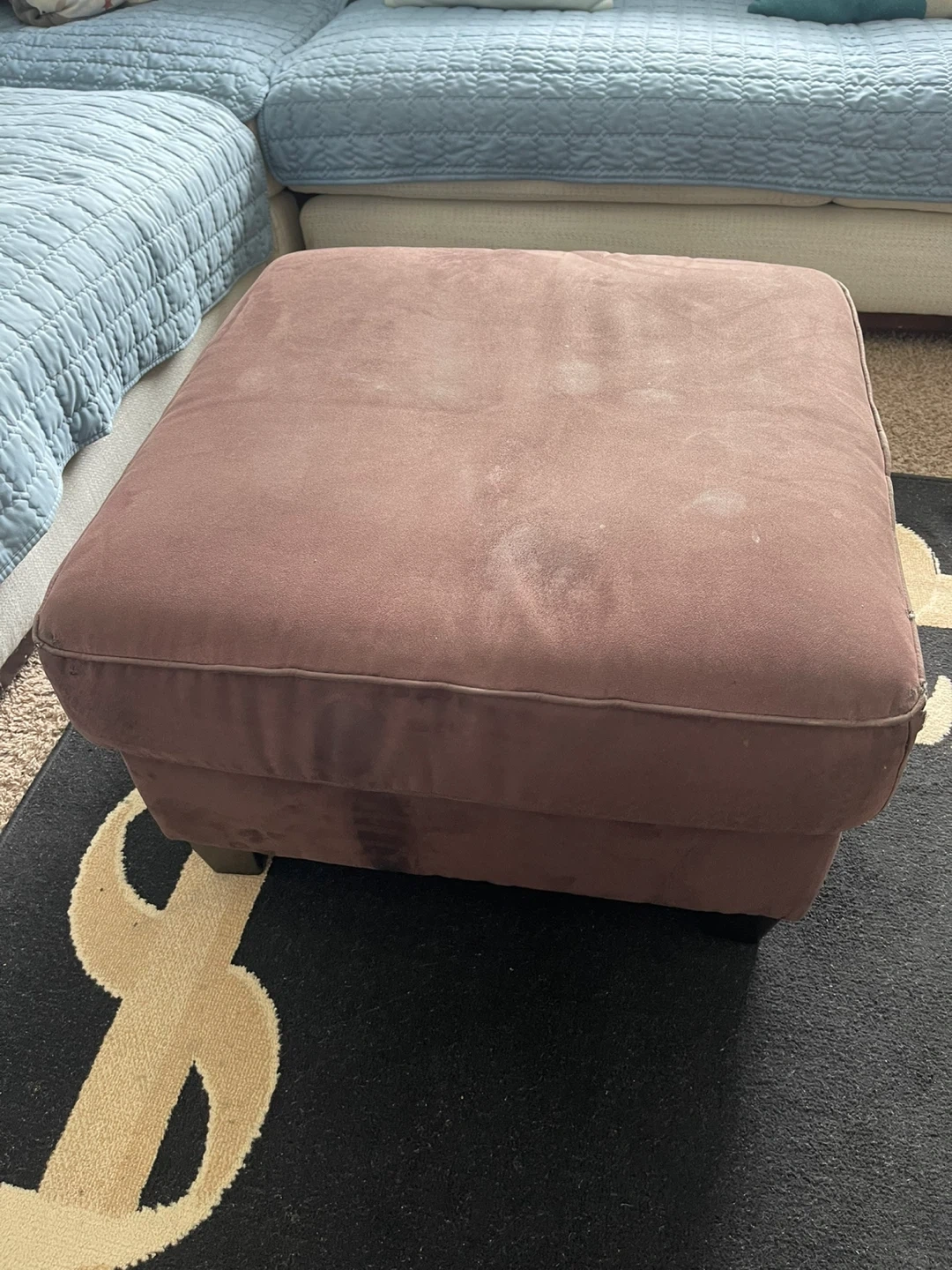 A brown fabric ottoman, perfect for resting your feet. It has some wear and tear on the corners, as shown in the photos.