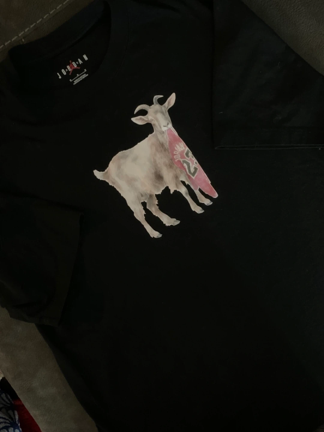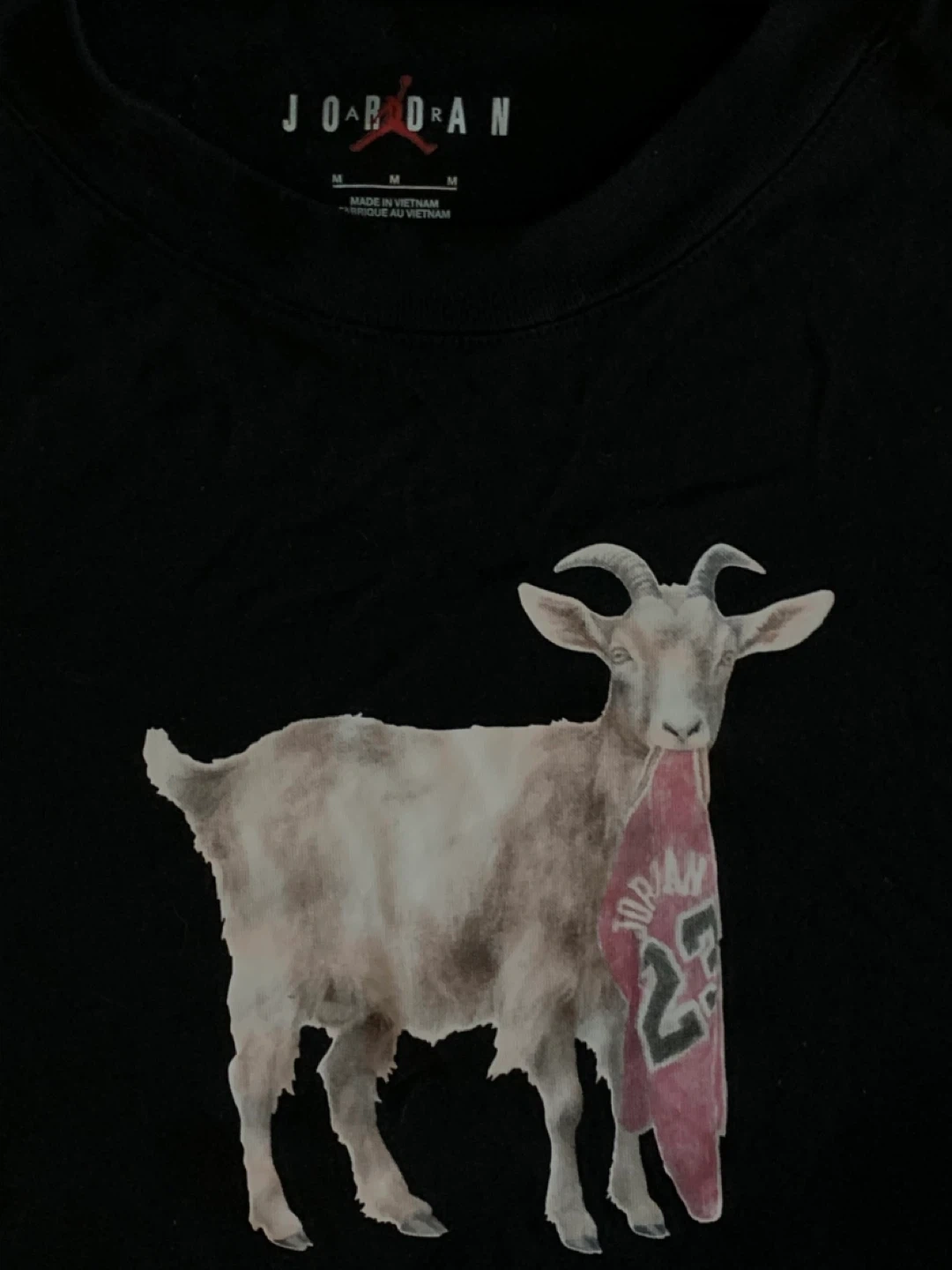Black Jordan t-shirt with a GOAT graphic on the front. Made in Vietnam. It's a size medium.
