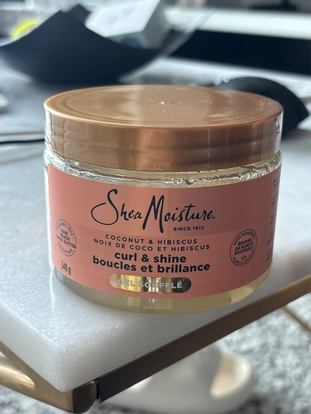 Shea Moisture Curl & Shine Gel Soufflé with Coconut & Hibiscus. Moisturizes and defines curls. 340g jar.