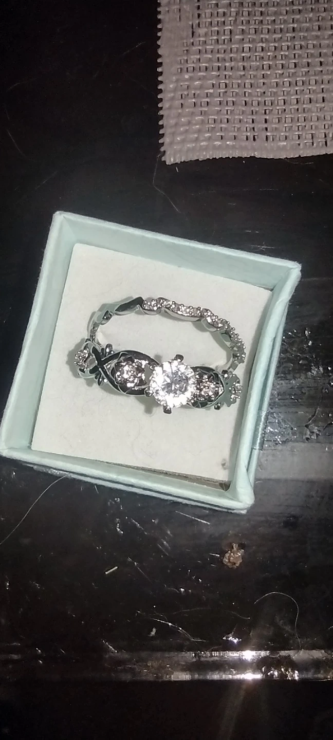 This is a two-piece engagement ring set. It features a central clear stone with intricate detailing on the band. The second ring is a matching band with smaller stones. It comes in a light blue gift box