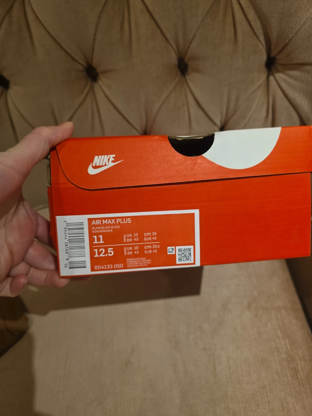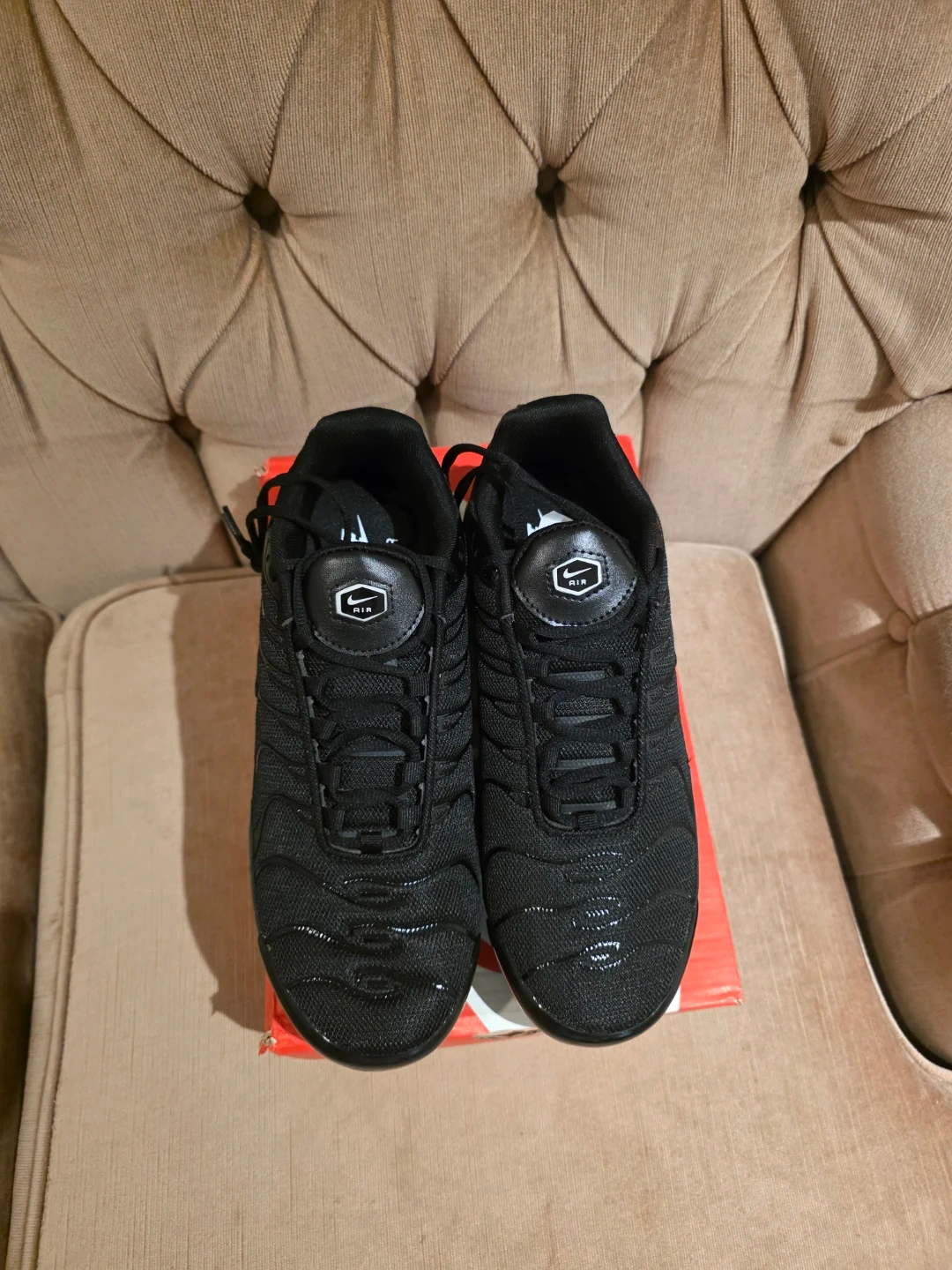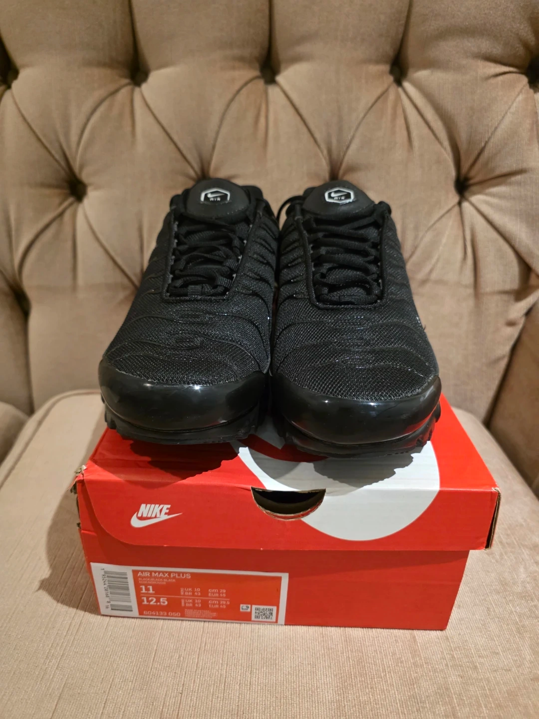These are Nike Air Max Plus sneakers in black. They come in the original box. The shoes are a size 11 US. Great for everyday wear!