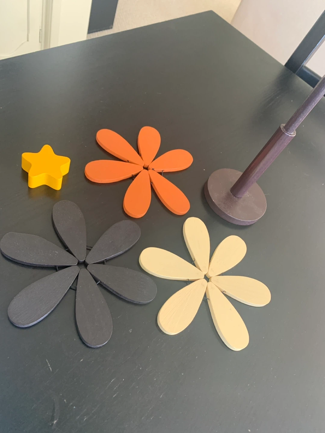 Set of 3 wooden coasters in flower shapes/Christmas tree, along with a decorative yellow star topper on a stand. One coaster is black, one is orange, and one is beige. They're designed to protect surfaces from hot or cold items. This item is handmade and brand new.