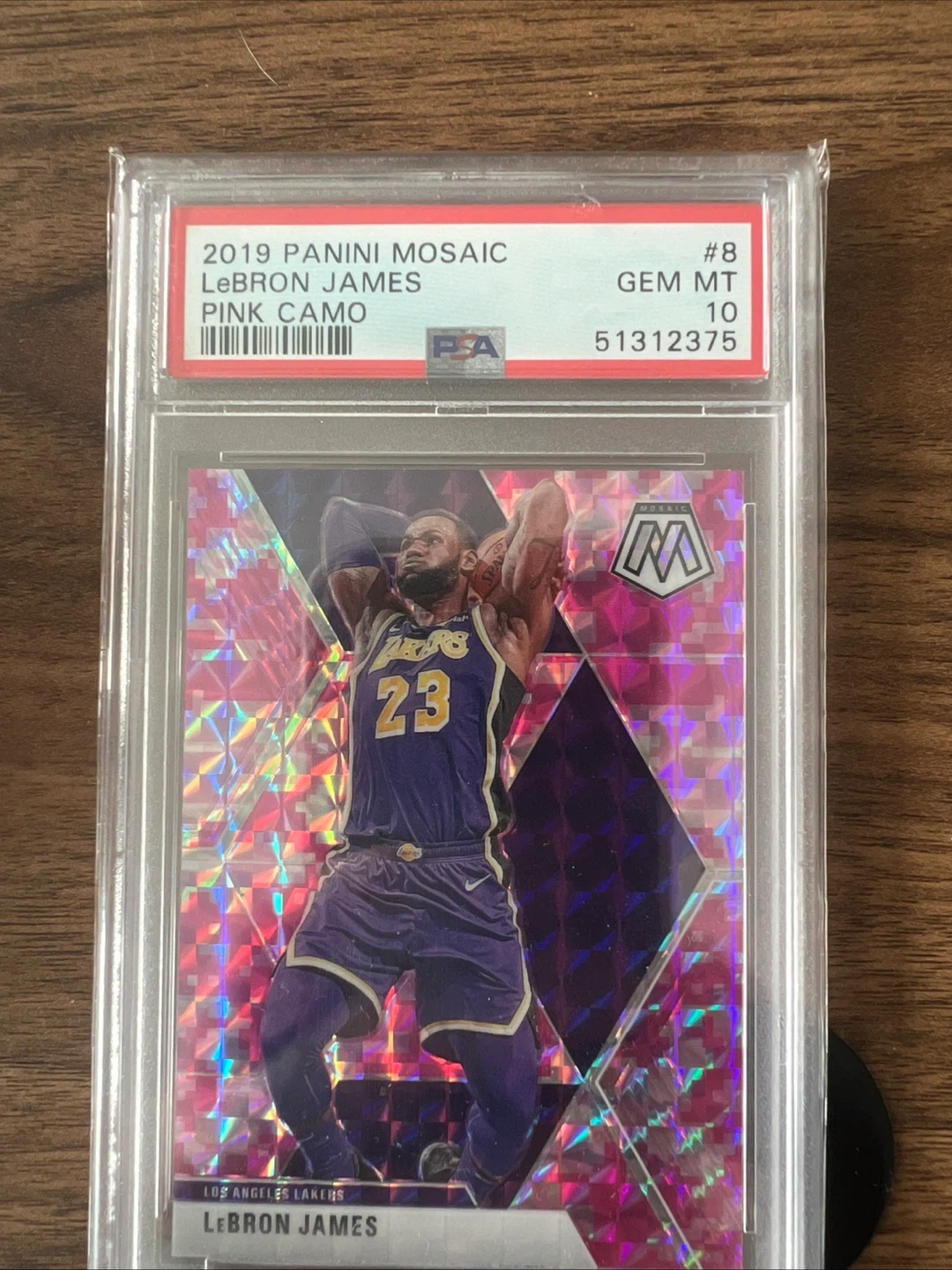 It's a 2019 Panini Mosaic LeBron James Pink Camo trading card graded PSA 10 Gem Mint. The card features LeBron James in his Los Angeles Lakers uniform. It's a highly collectible item for basketball fans and collectors.