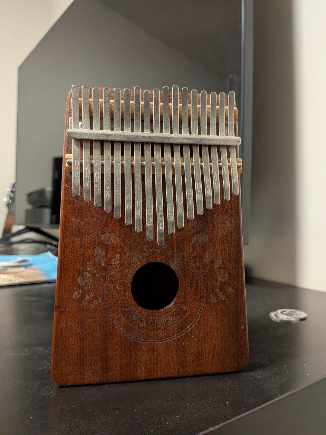 This is a 17-key Kalimba thumb piano. It's made of wood with metal tines. Notes are engraved on the tines for easy playing. It has a round sound hole on the front.