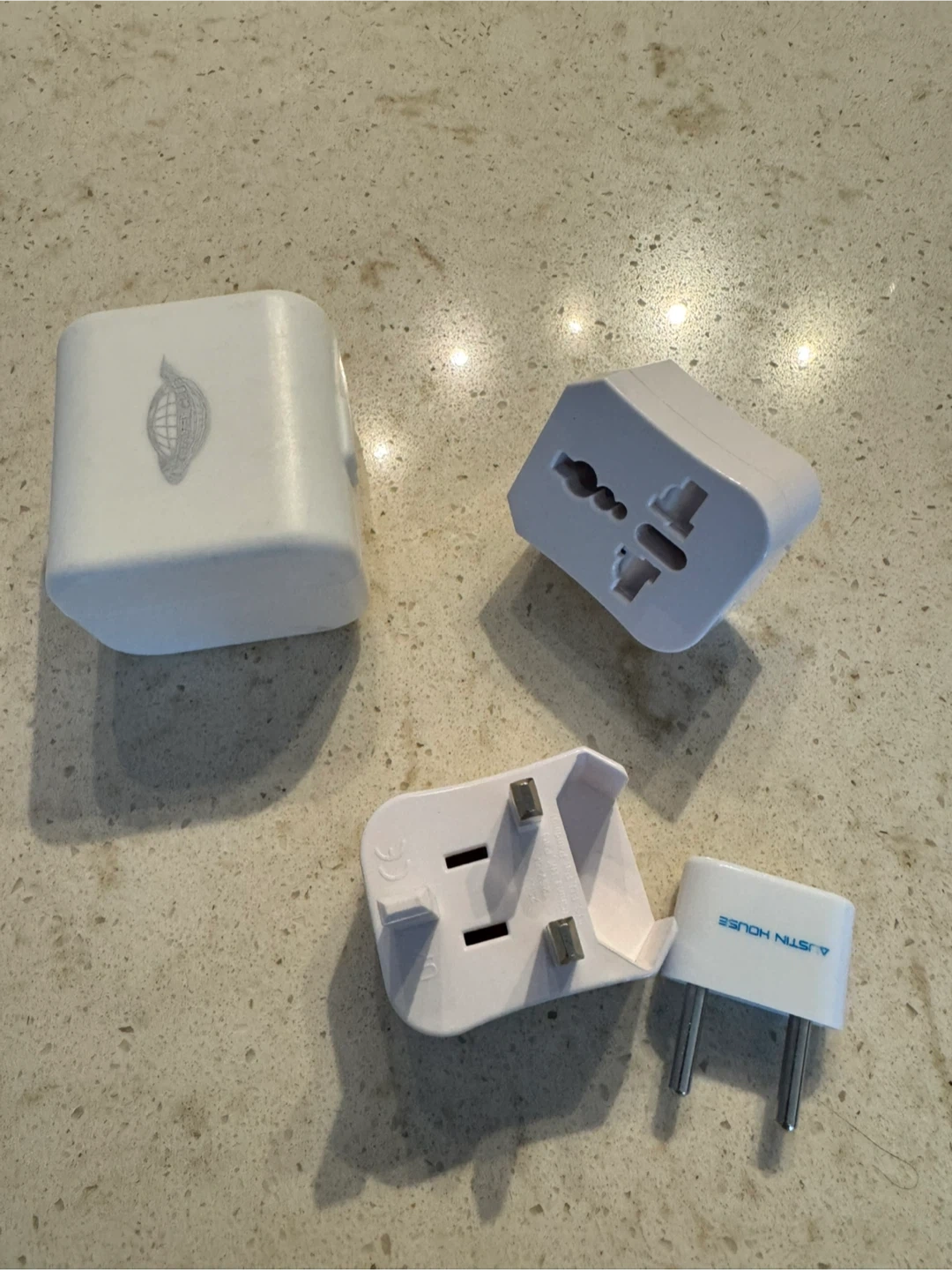 This is a white universal travel adapter set, including a main adapter and three interchangeable plug types. It also comes with a white carrying case. This adapter set is handy for international travel.
