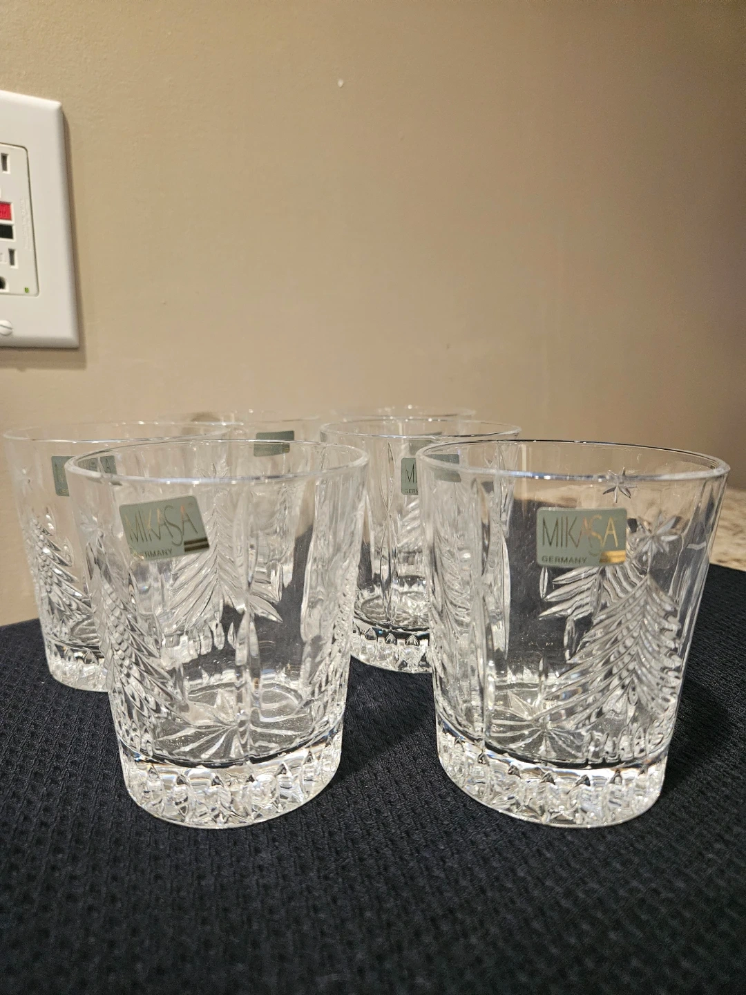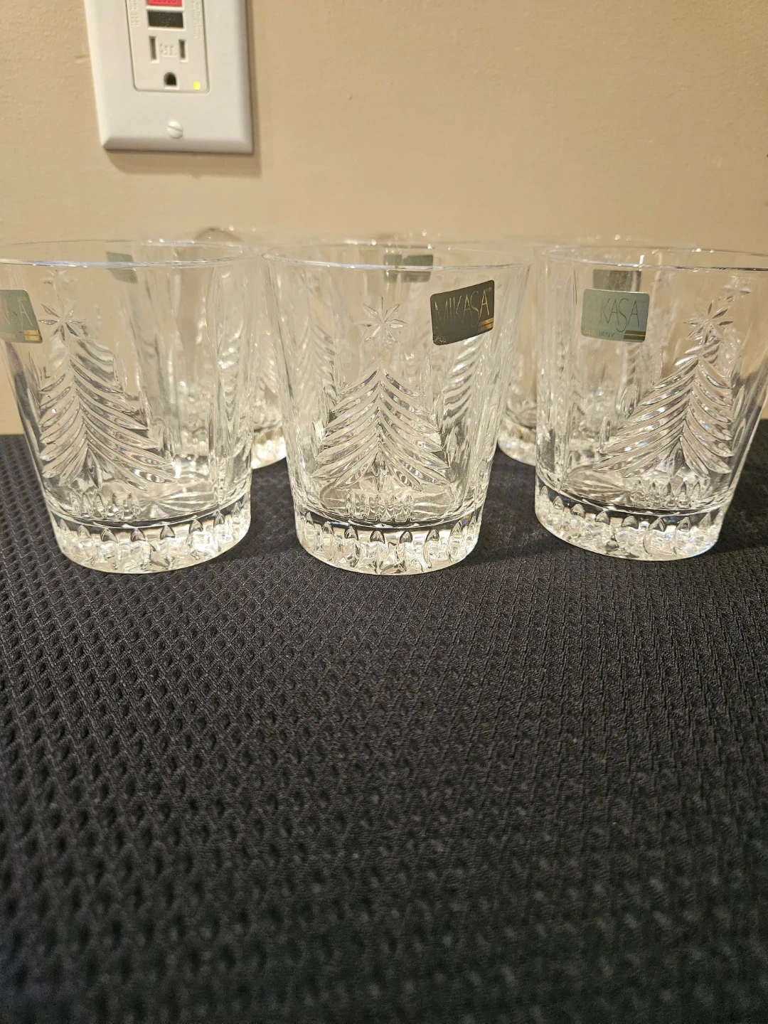 Set of six Mikasa crystal glass tumblers featuring an etched tree and star design. These glasses have a timeless look perfect for everyday use or special occasions. They're sturdy and beautifully crafted.