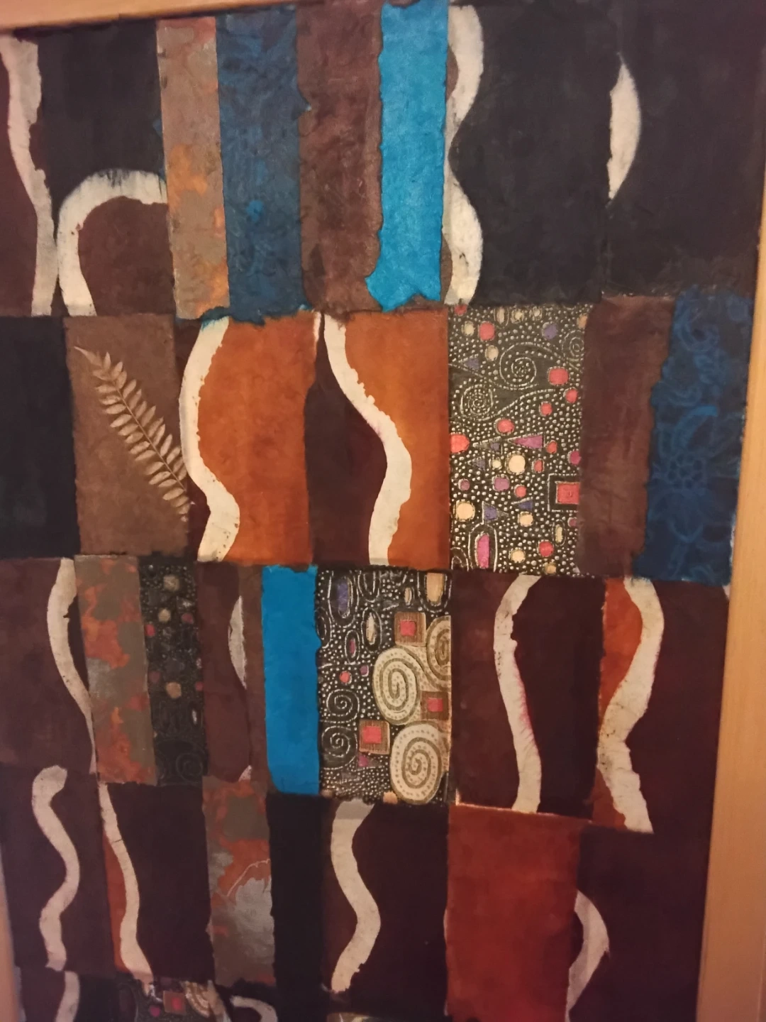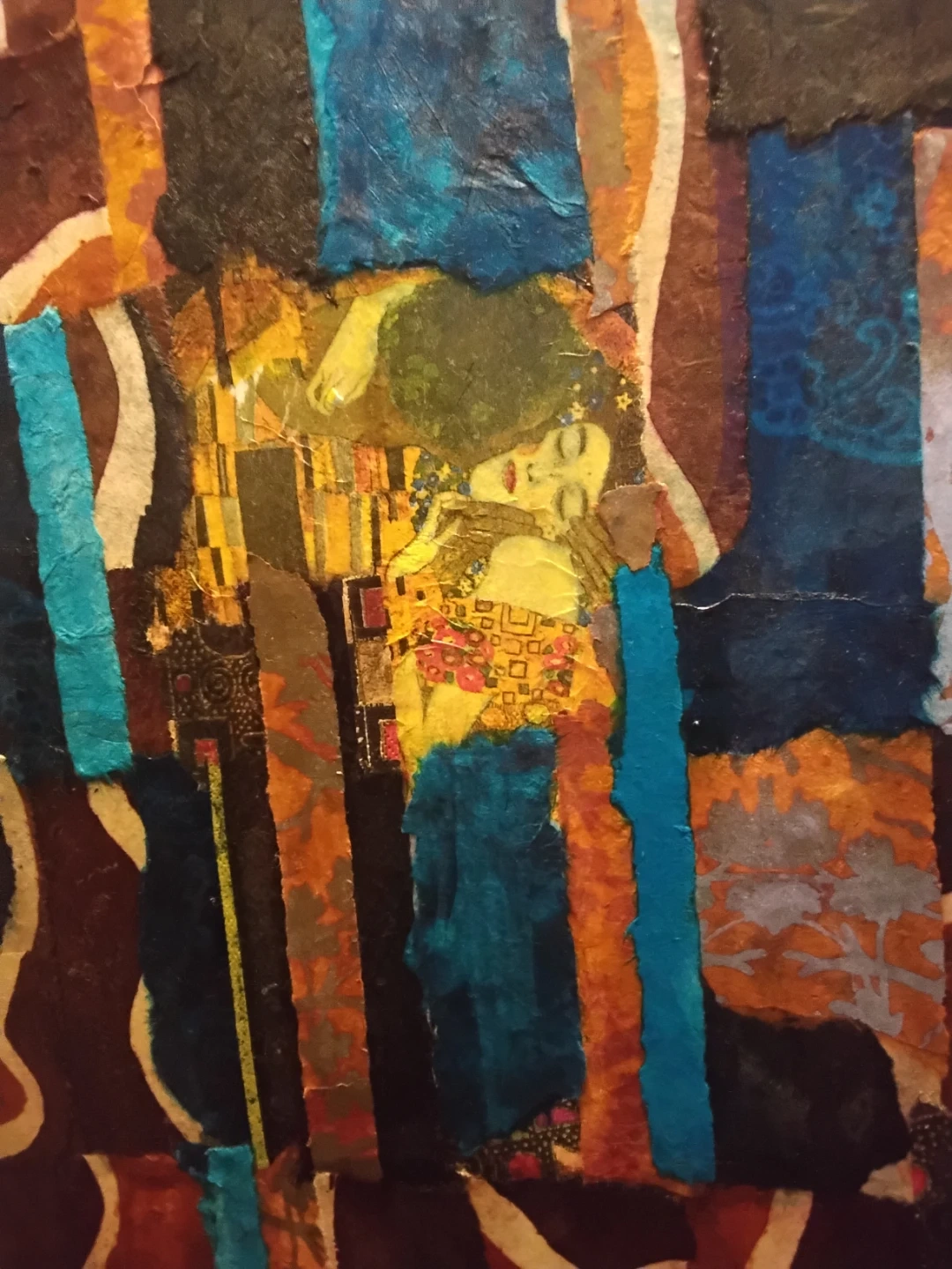 Decorative folding screen with 3 panels featuring a print inspired by Klimt's "The Kiss." It's made with textured paper collage elements in shades of brown, blue, and gold. This screen is a striking piece for dividing spaces or as a wall accent.
