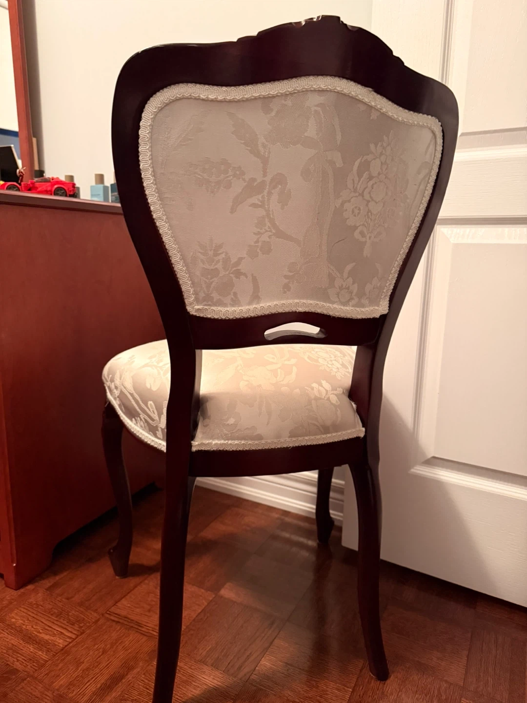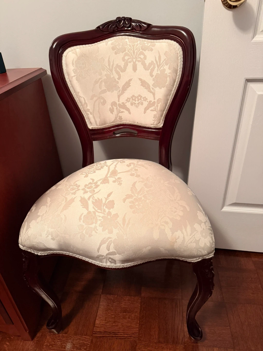 This elegant accent chair features a dark wood frame with ornate carvings. It's upholstered in a cream-colored damask fabric, offering a vintage-inspired look. The chair's contoured back and padded seat ensure comfort. It's a beautiful addition to any room needing a touch of classic style!