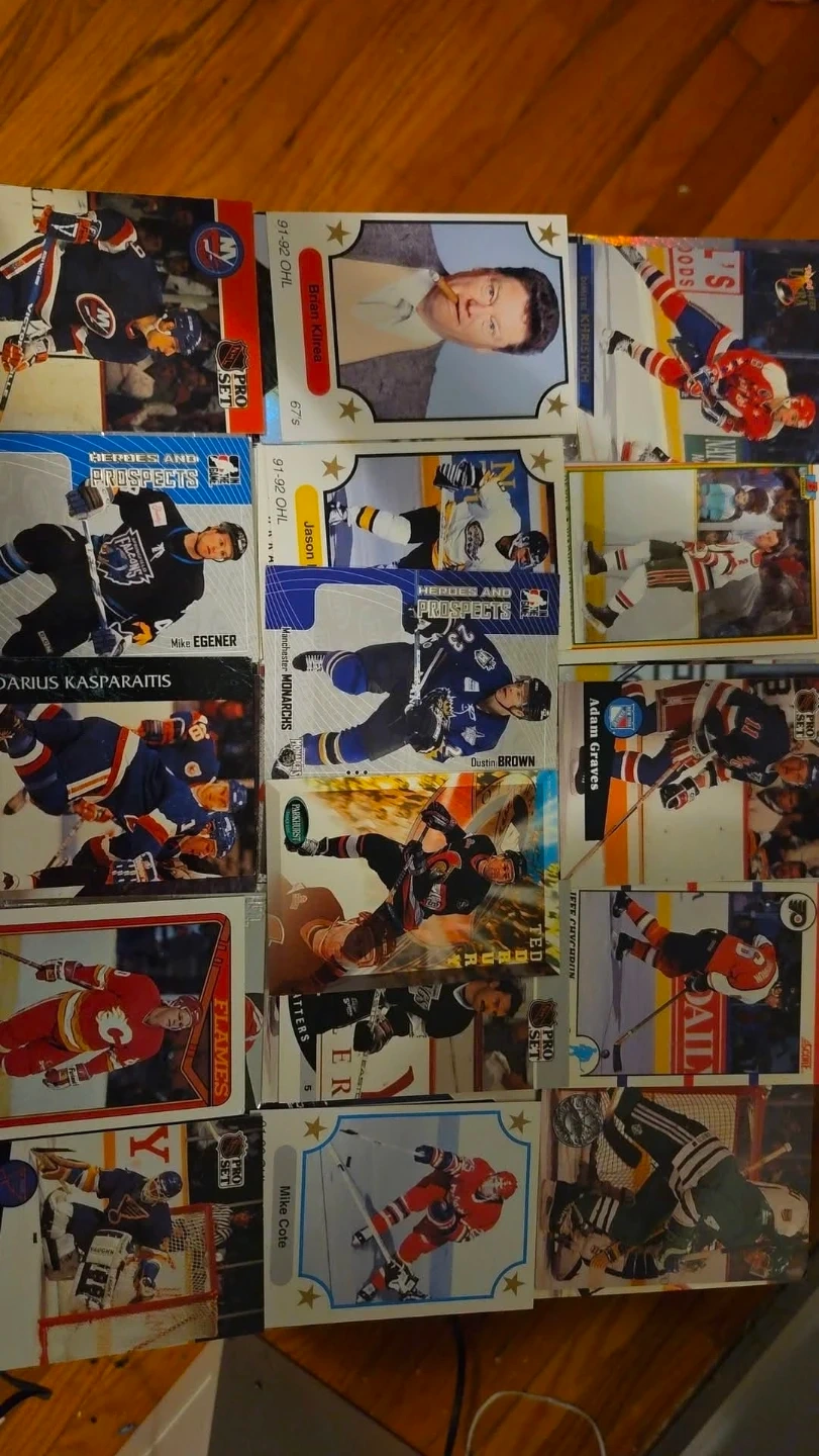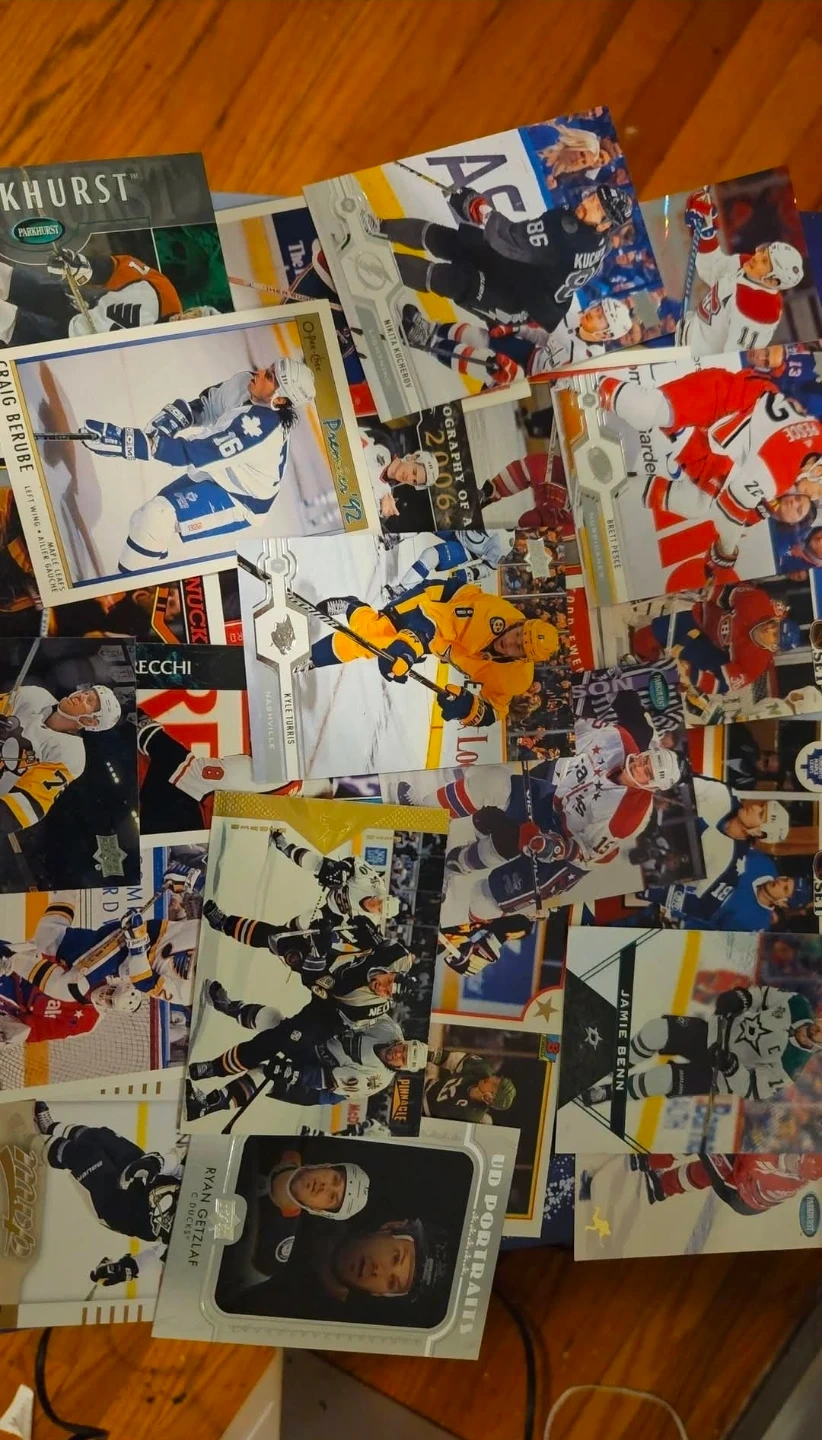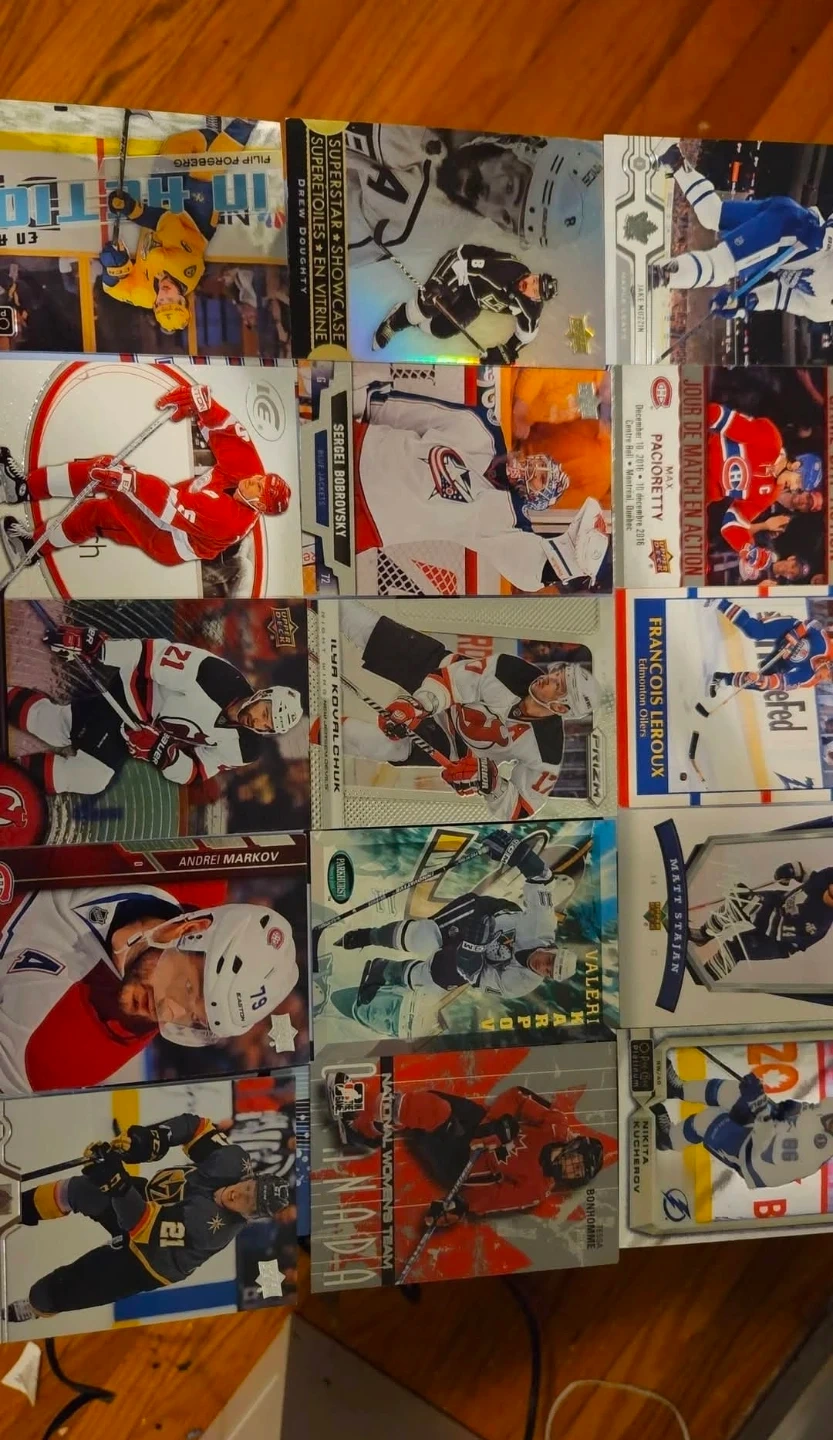 Collection of various NHL hockey cards featuring different players and teams. Cards include rookies and established stars. Great for any hockey card collector!
