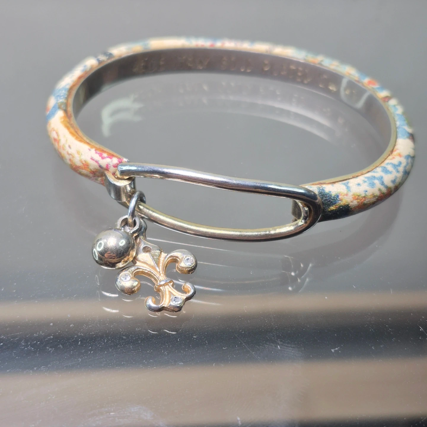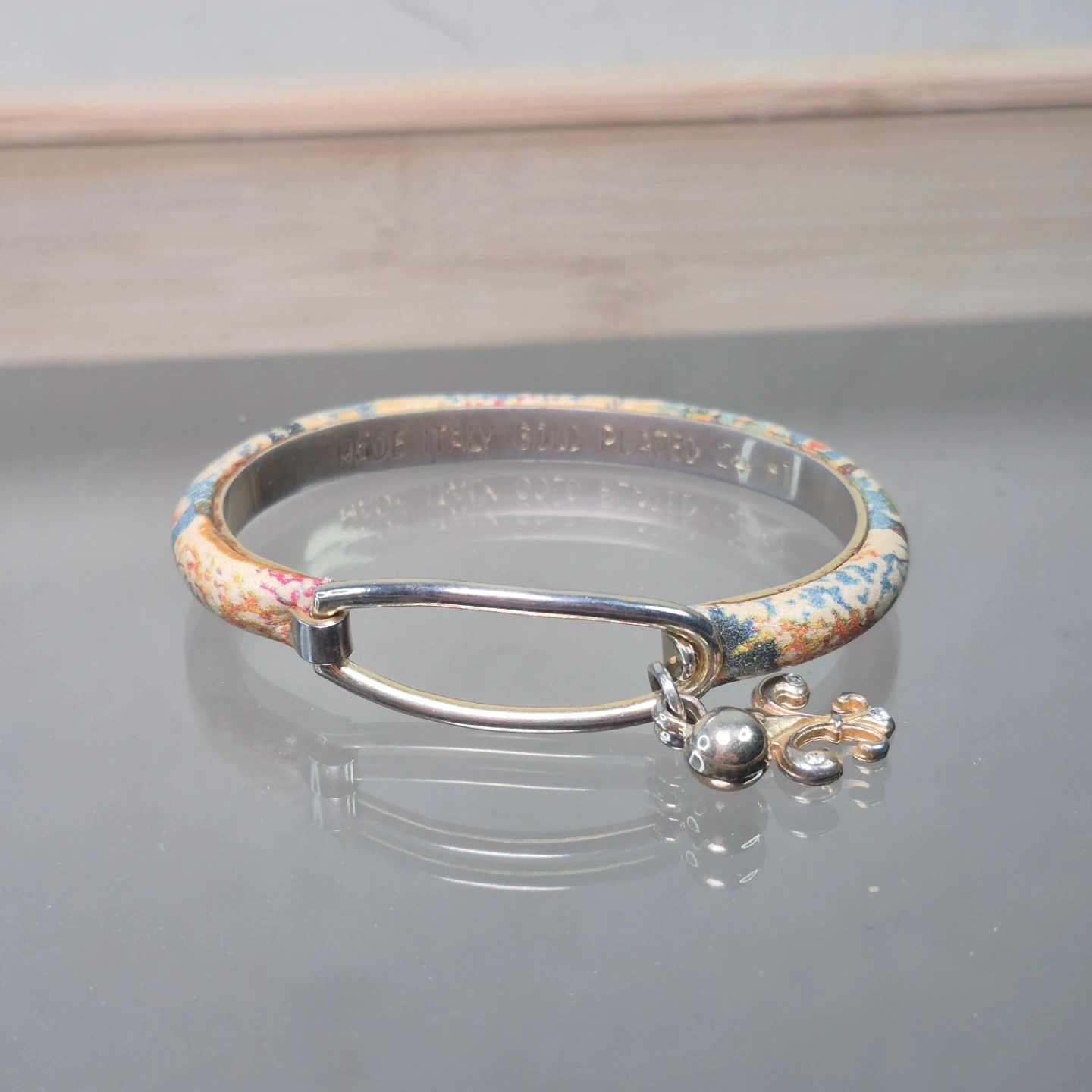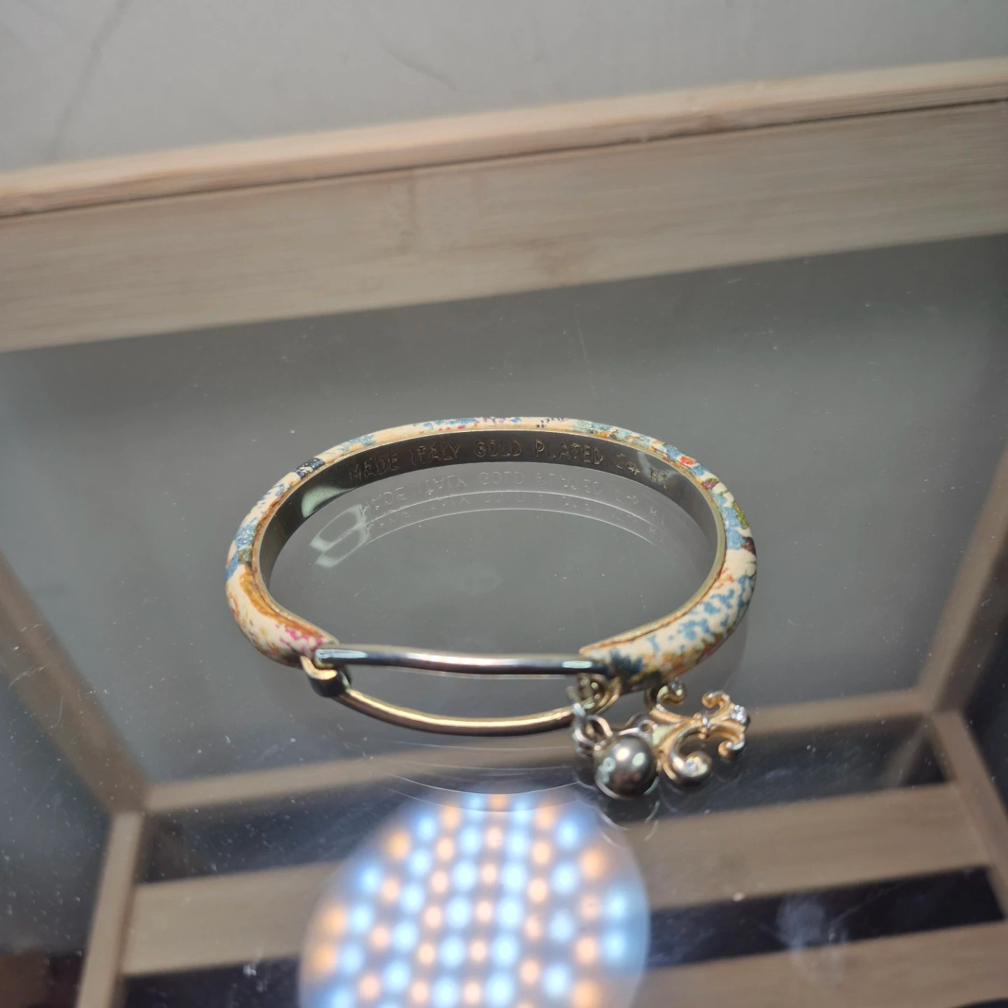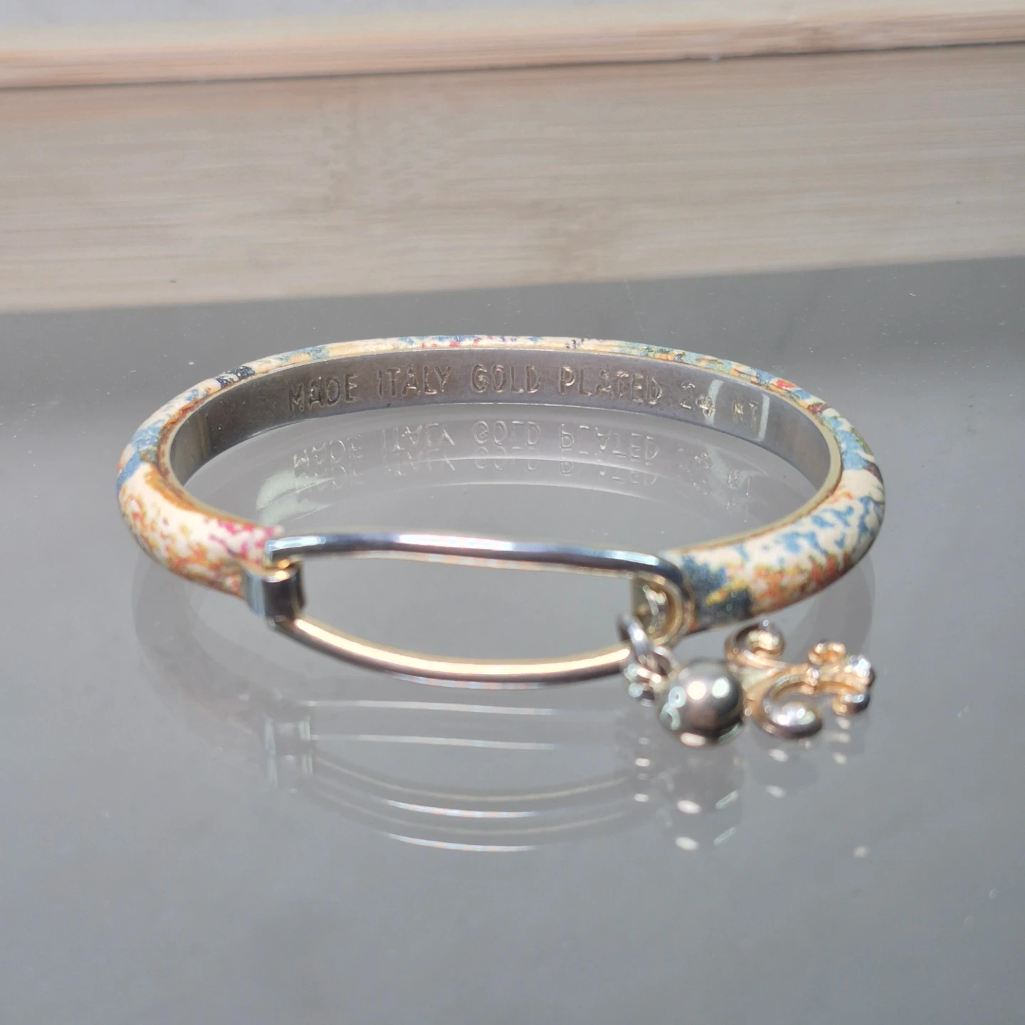 This is a gold-plated bangle bracelet made in Italy. It features a colourful abstract pattern and a decorative charm with a fleur-de-lis accent. The bracelet has a secure clasp closure.