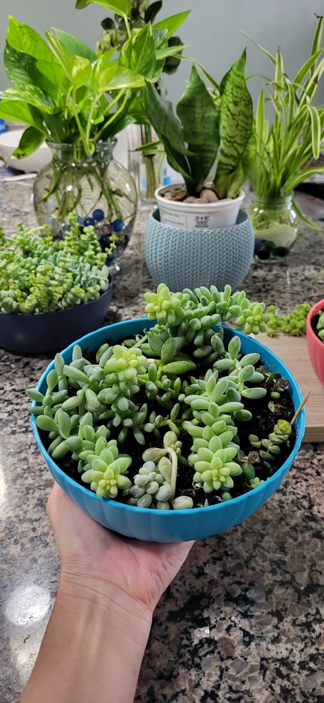 Three types of succulent in a cute plastic pot: Baby Silver Jelly Bean & Crassula perforata, majority are Burro's Tails succulent.