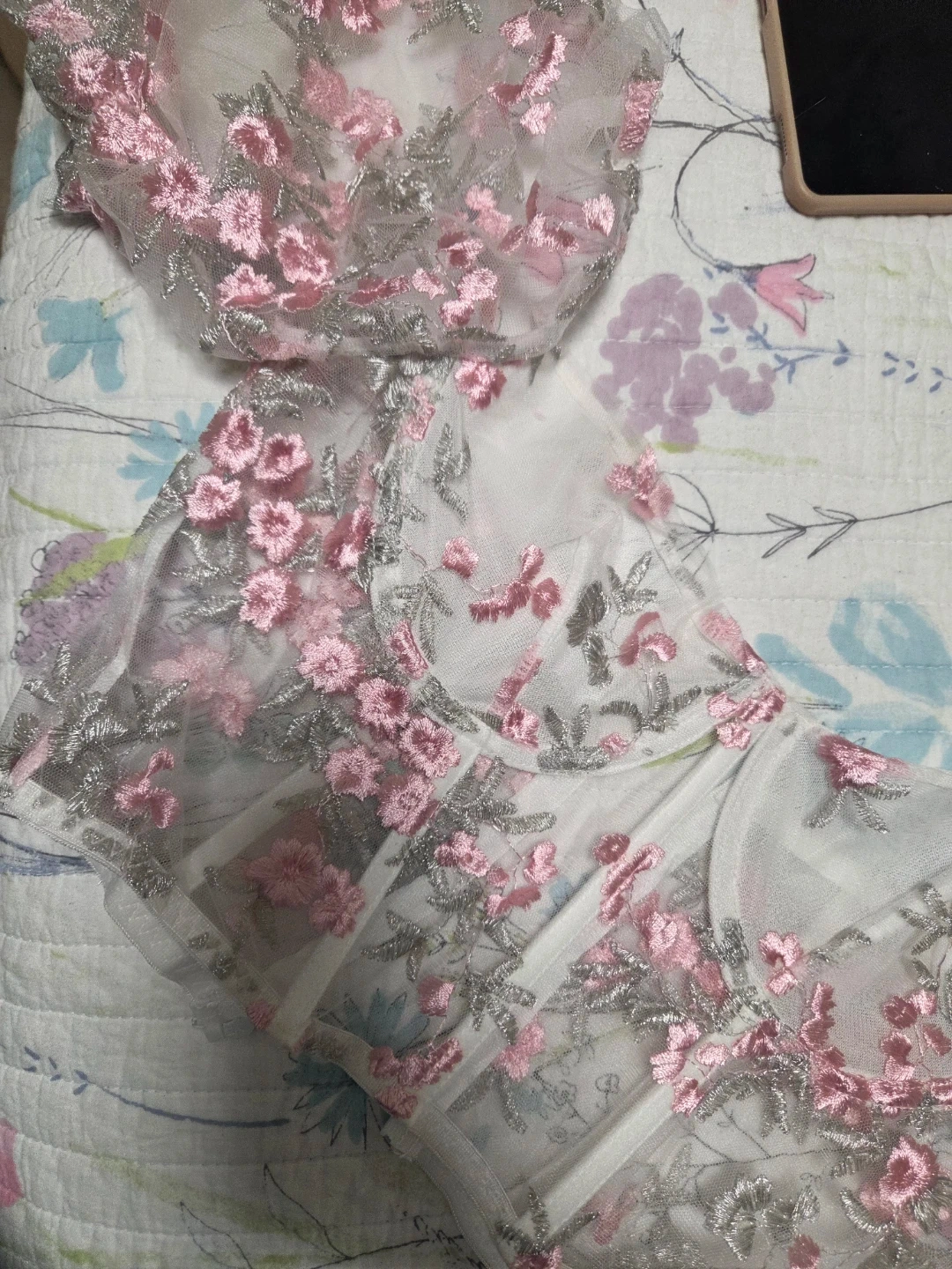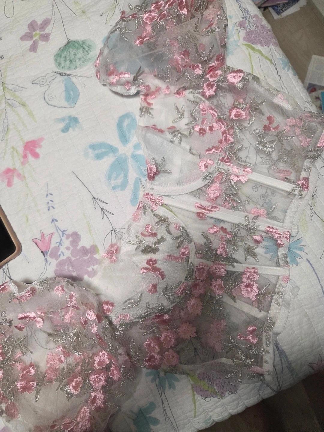 brand new never worn Sheer white corset top with delicate pink and silver floral embroidery. Features include boning for structure and adjustable straps. Fabric is a mesh-like material with embroidered details.
