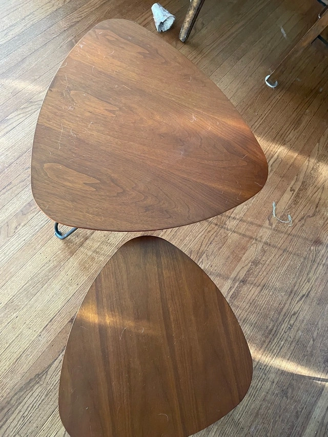 Two nesting coffee tables with a stylish mid-century modern design and triangular tops. They have a warm wood finish. If the ad is up, they're still available!