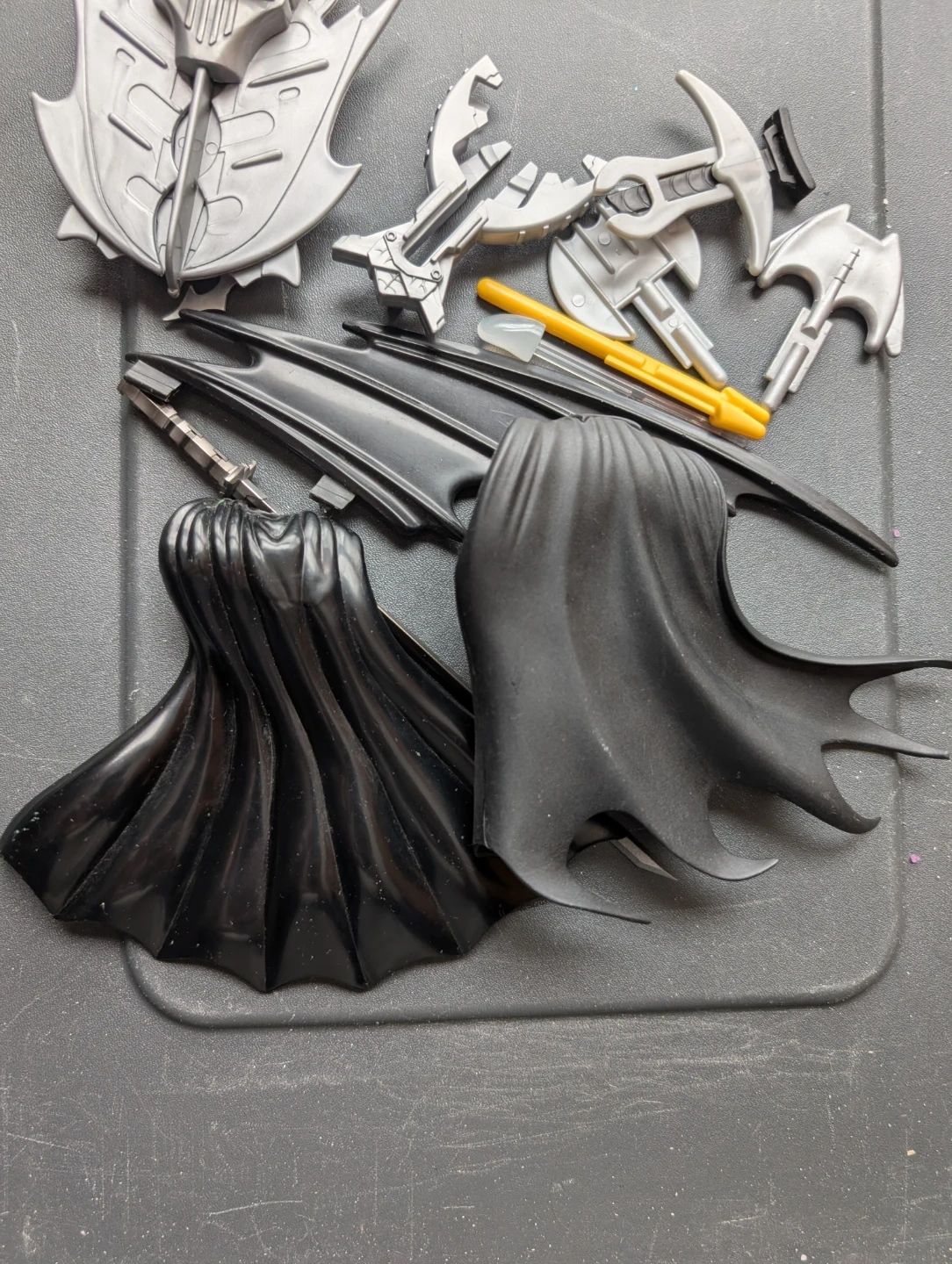 This lot includes various Batman-themed accessories, featuring two black capes and several grey and silver-coloured utility pieces. There's also a yellow accessory that looks like a grappling hook or tool. These are great for customizing action figures or for display purposes!