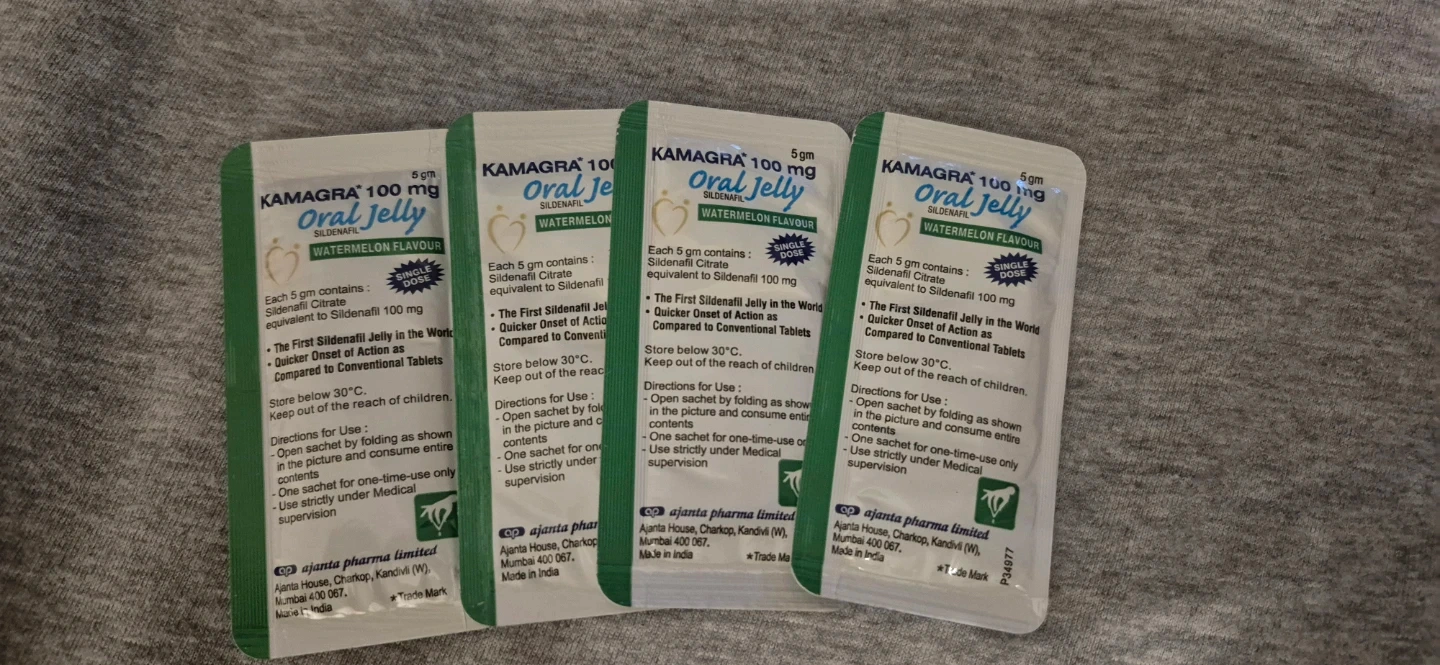 Four Kamagra Oral Jelly sachets, each 5 gm. Each contains Sildenafil Citrate equivalent to Sildenafil 100 mg. This oral jelly is watermelon flavoured. Store below 30°C and keep out of reach of children.