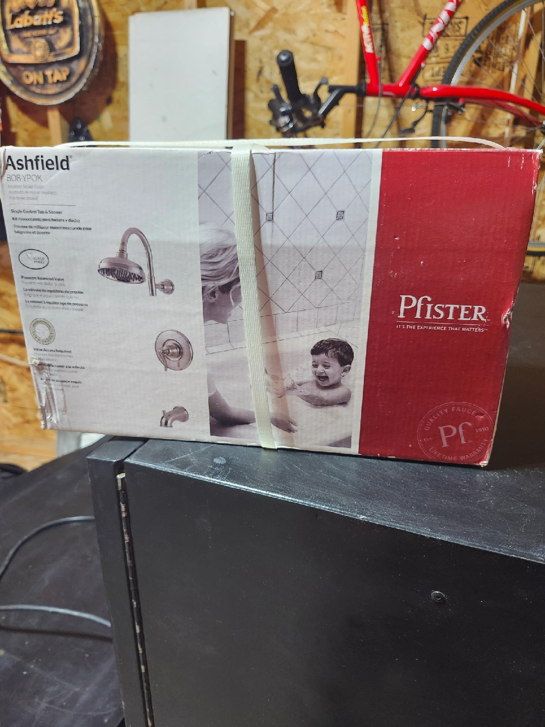 Selling a Pfister Ashfield single control tub and shower kit, model 808-YPOK. It features a brushed nickel finish and includes a pressure-balanced valve. The kit is designed for single-handle operation and comes with everything needed for installation!