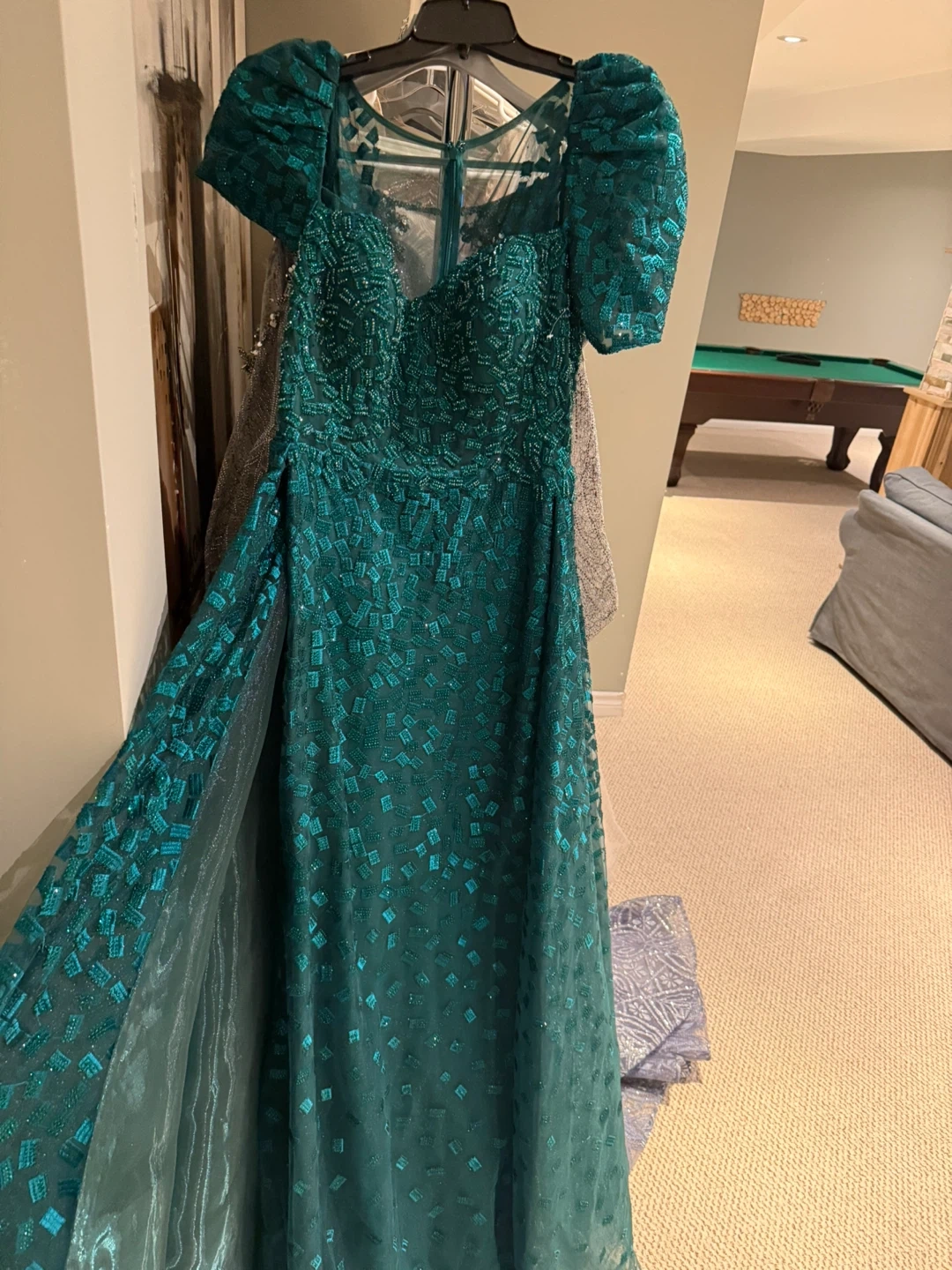 Stunning emerald green formal gown with intricate beading and puff sleeves. It features a sweetheart neckline and a flowing skirt. Perfect for galas or special events!