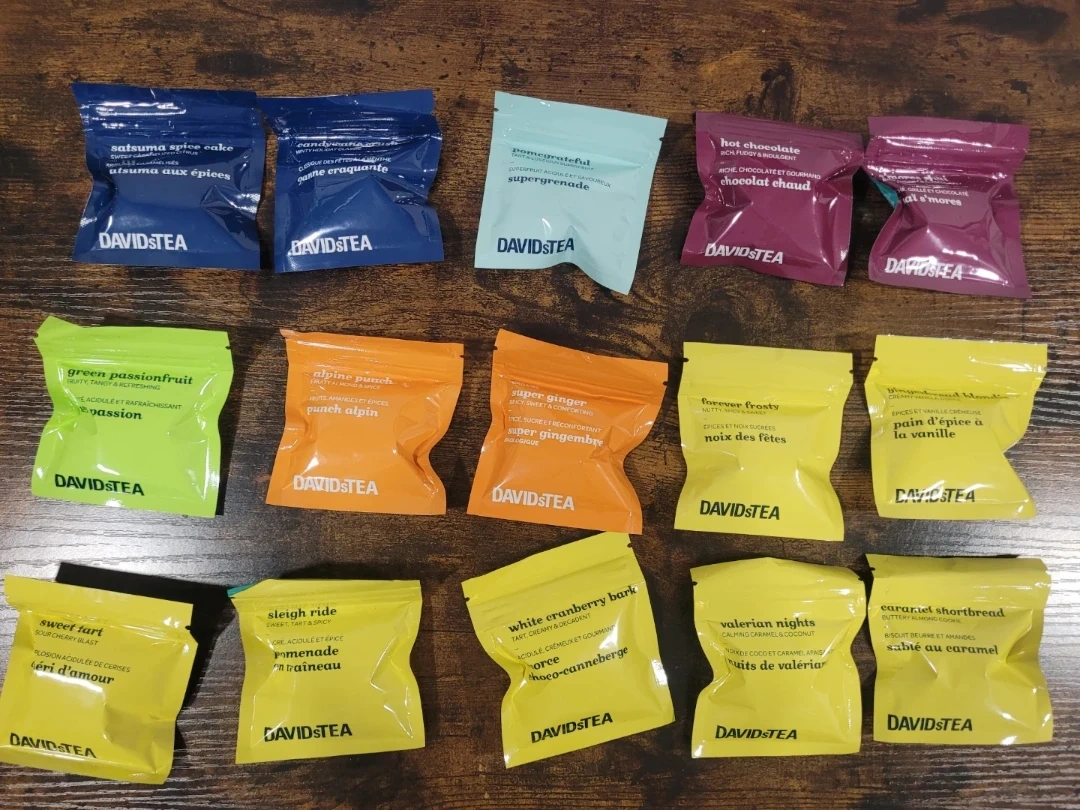 This is a collection of 15 DAVIDsTEA loose leaf tea packs. It includes a variety of flavours like Satsuma Spice Cake, Pomegrateful, and Hot Chocolate. Never been opened!