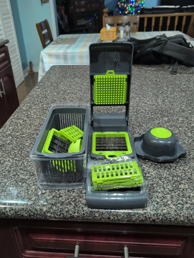 This vegetable chopper comes with a clear container and several interchangeable blades for dicing and slicing. It's designed for quick meal prep. Includes multiple cutting grids for different results.