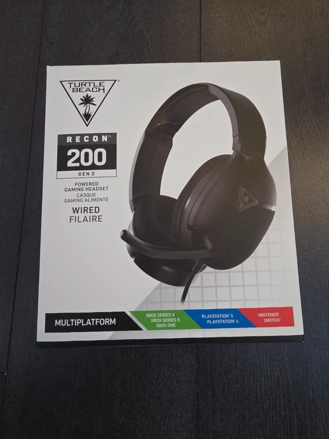 This is the Turtle Beach Recon 200 Gen 2 wired gaming headset. It features amplified 40mm speakers and a flip-to-mute mic. It offers 12-hour battery life and variable mic monitoring. It's compatible with Xbox, PlayStation, Switch, and PC.