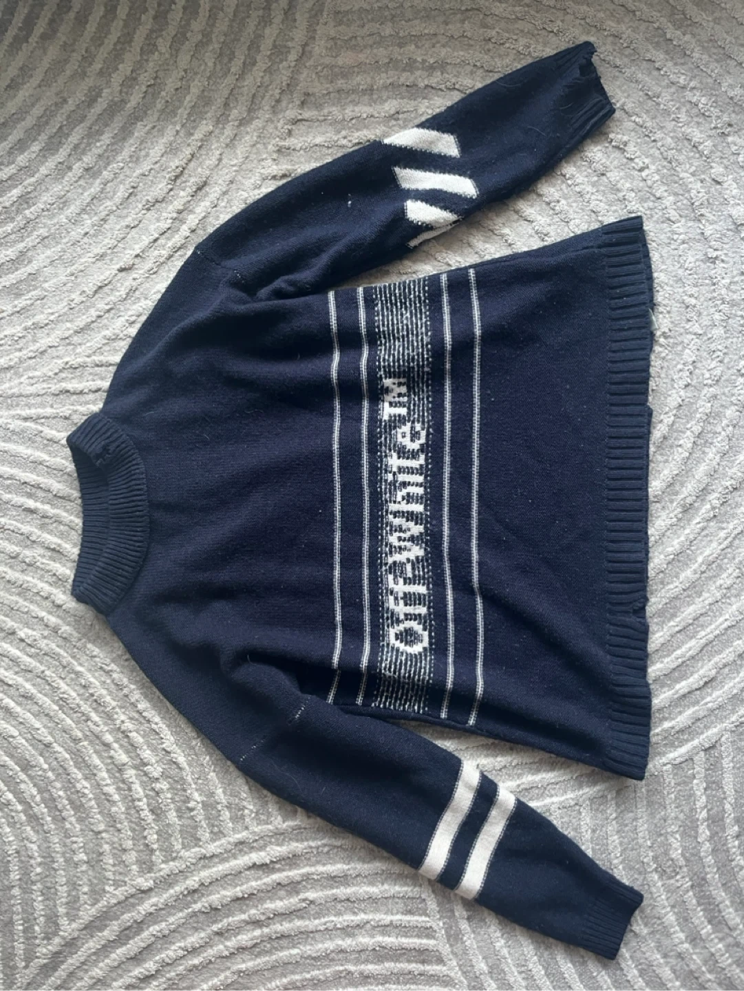 OFF-WHITE knit sweater in navy blue. It features white stripes on the sleeves and the brand name on the front. This sweater is made of a soft knit material.